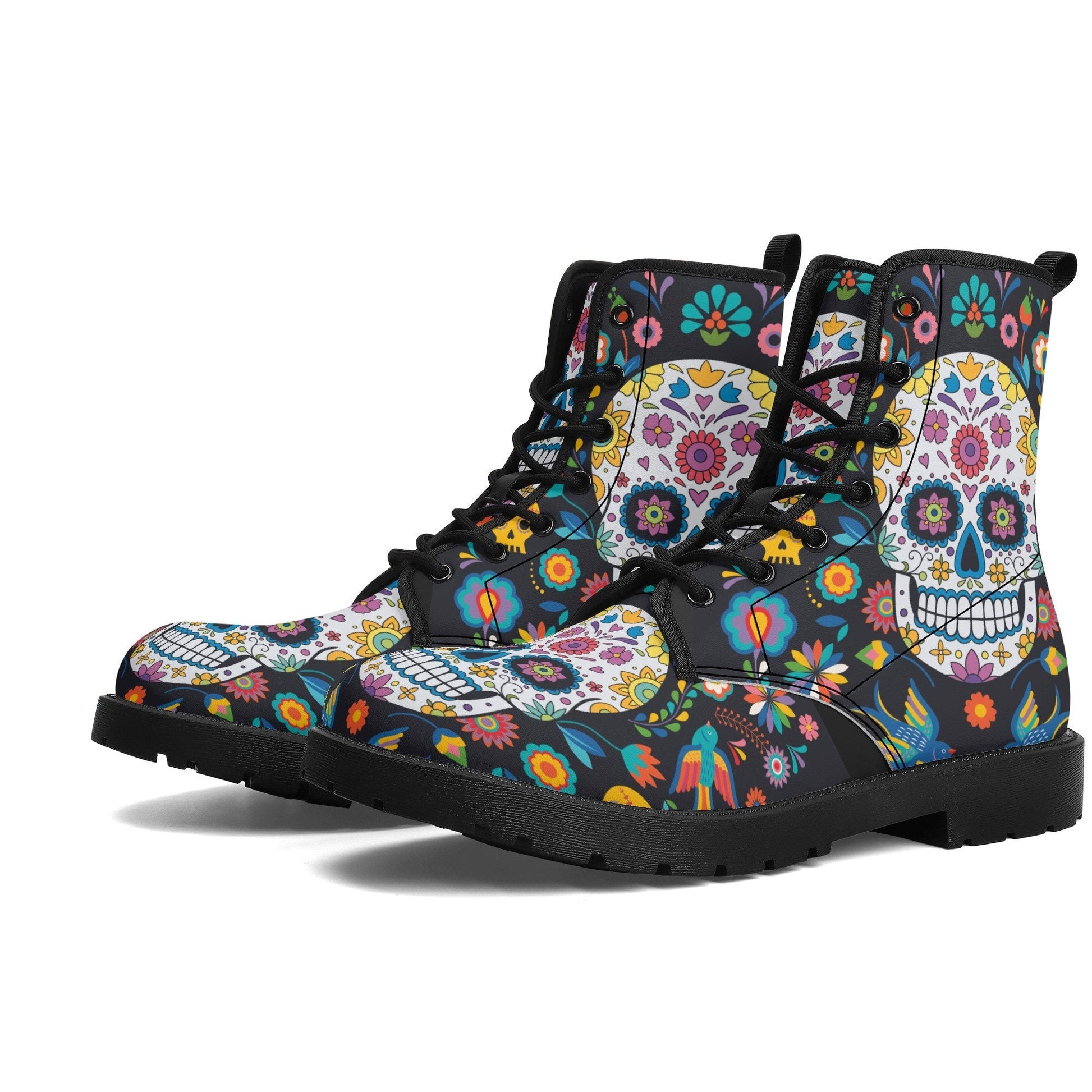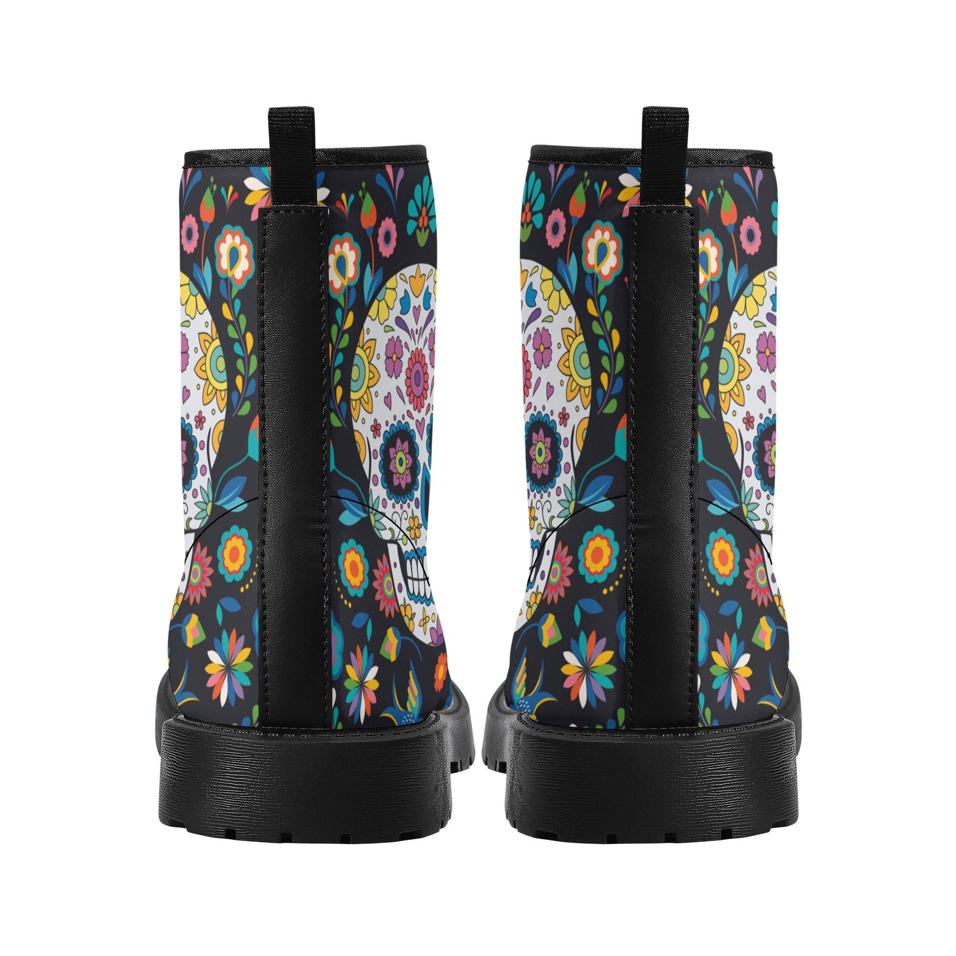 Day of the dead skull boots for men women, Mexican calaveras candy skull women boots skeleton boots, Mexican skulls men leather boots shoes WOMEN SIZE Size______Foot Length (cm) US5_______23.1cm US5.5_____23.8cm US6_______24.4cm US7_______25.1cm US8_______25.7cm US9_______26.4cm US10______27.0cm US11______27.7cm US11.5____28.3cm US12______29.0cm MEN SIZE Size______Foot Length (cm) US5_______25.1cm US6_______25.7cm US7_______26.2cm US7.5_____27.1cm US8.5_____27.7cm US9.5_____28.3cm US10_______29.0cm US11______29.6cm US12_____30.3cm US13______30.9cm US14______31.6cm High quality eco-friendly synthtic leather material on waterproof boots New style for black gum rubber outsole and black rear pull-loop Breathable EVA foamed insole anti-heat, anti-moisture, anti-corrosion Mesh fabric and foamed lining with lace-up closure for a snug fit Platform measures approx 0.75”for traction and durability A groovy colour explosion for your feet in our signature unisex combat boots Designed for fashion people, stylish and personalized The Upper Made of PU,the sole made of rubber. Soft PU make it comfortable and soft. Two different colors of sole. Rear pull-loop make the boots easy to put on. Season: Autumn, Spring, Winter Occasion: Outdoor, Daily Gender:Women Care Instruction: Spot clean only ======== All products in our store are only manufactured upon receiving an order from the customer. Please carefully review the product description and dimensions in the illustrative images before placing an order. The following cases are not eligible for return/exchange: 1. The product you receive matches the description. 2. The product dimensions (with illustrative images describing the dimensions) you receive match the description. 3. The product has been customized as per your request (e.g., printed with your name/image).