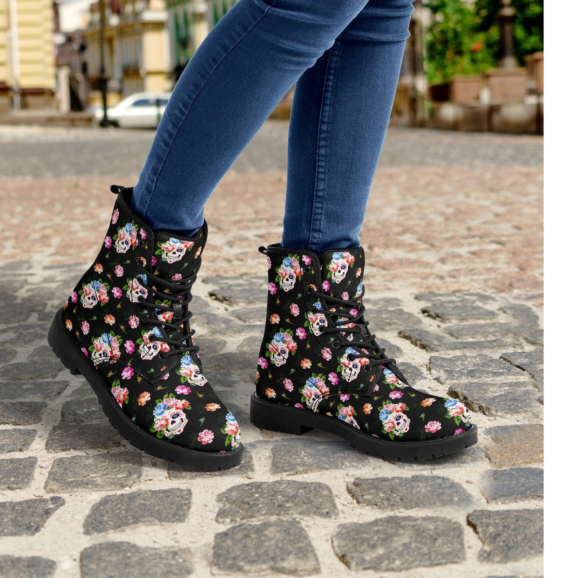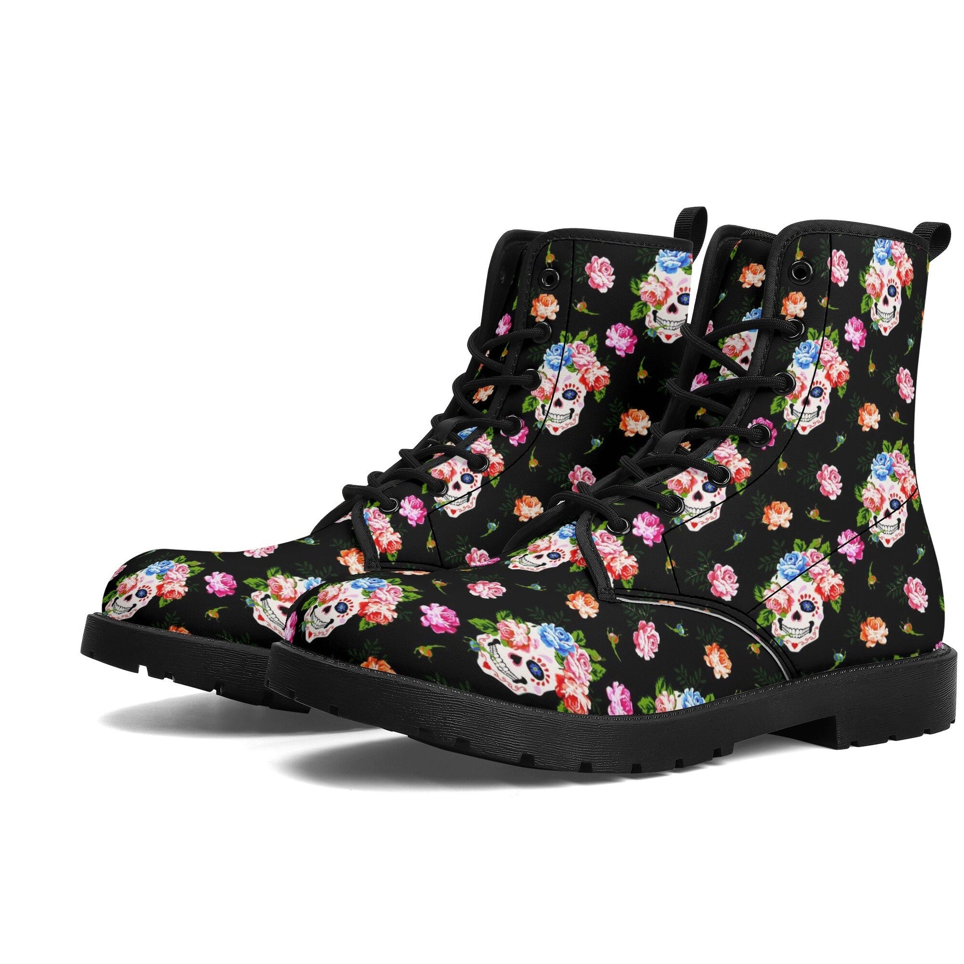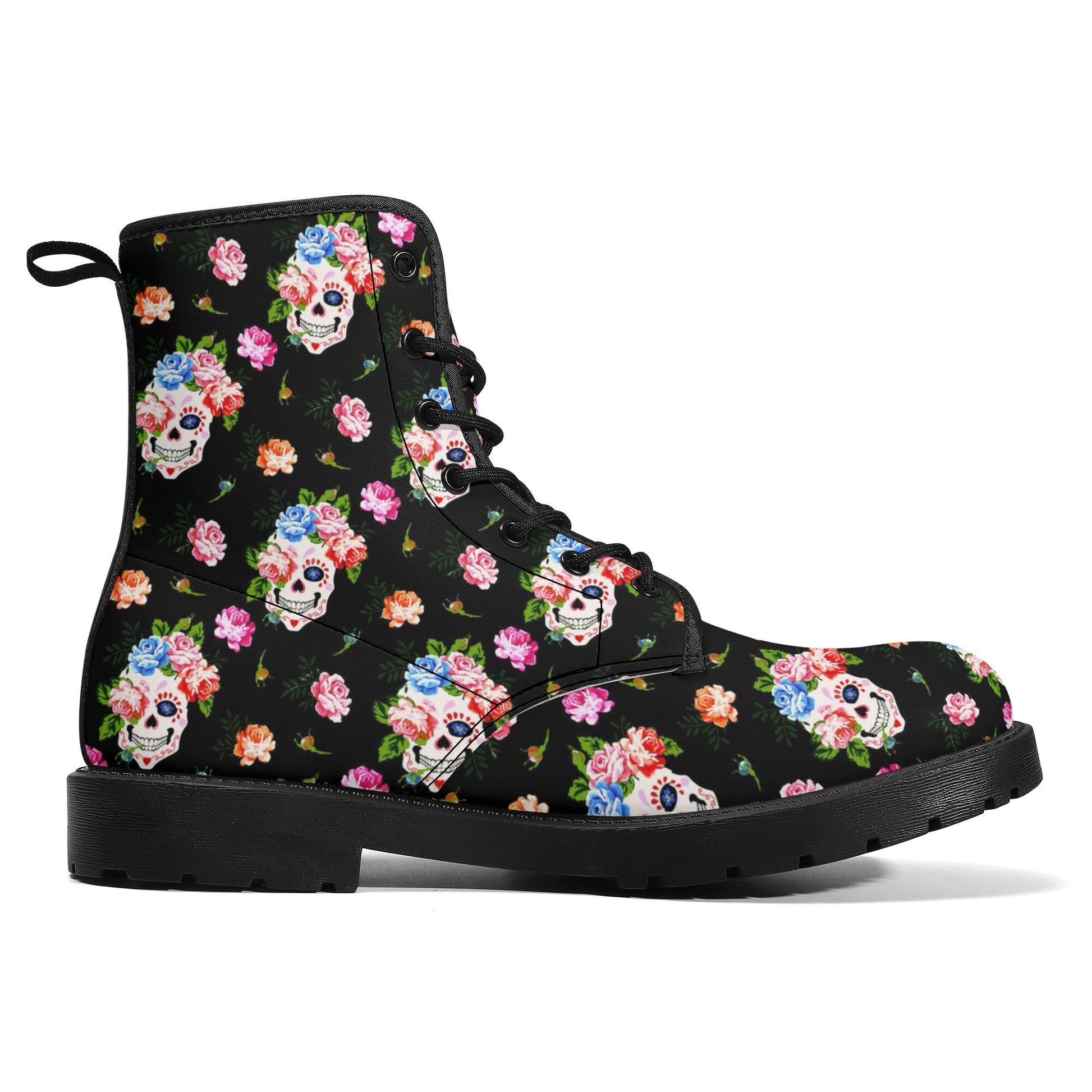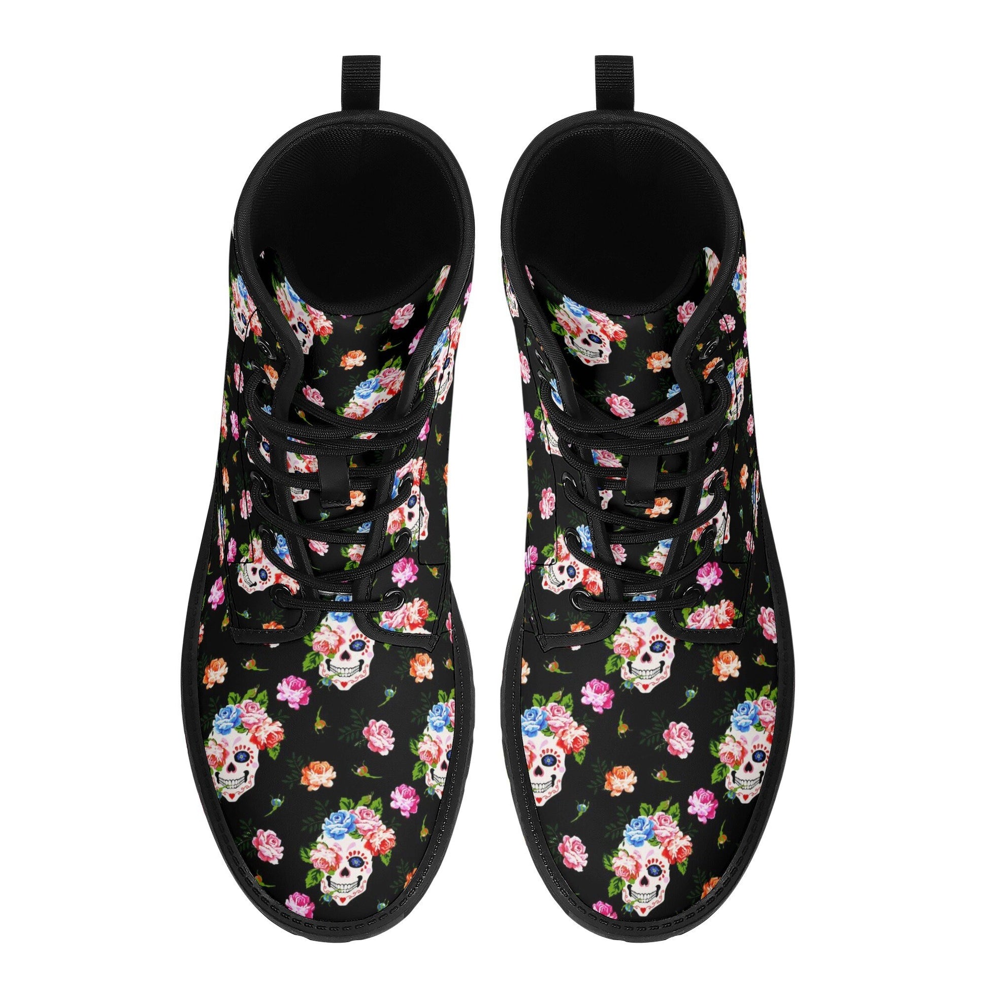 Floral skull day of the dead leather boots, Calaveras Sugar skull boots men women, Dia de los muertos skull boots shoes, Candy skull boots