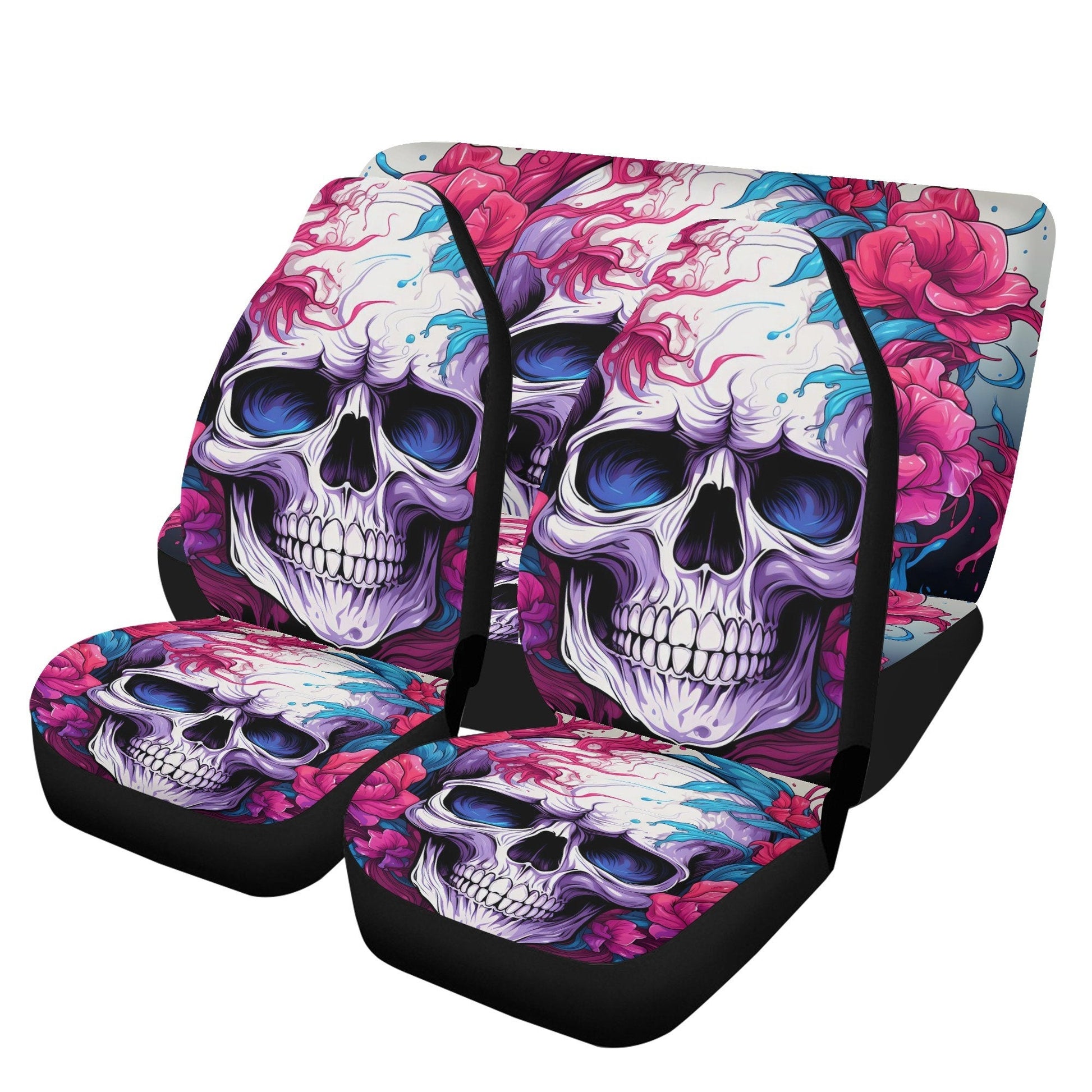 Halloween seat cushion, biker skull floor mat for car, flower skull car seat protector, devil ghost car headrest covers, hooded skull armrest covers, rose skull truck seat cover, grim reaper car shifter gear cover, flaming skull front back seat covers, skull car seat, evil face front and back car seat covers