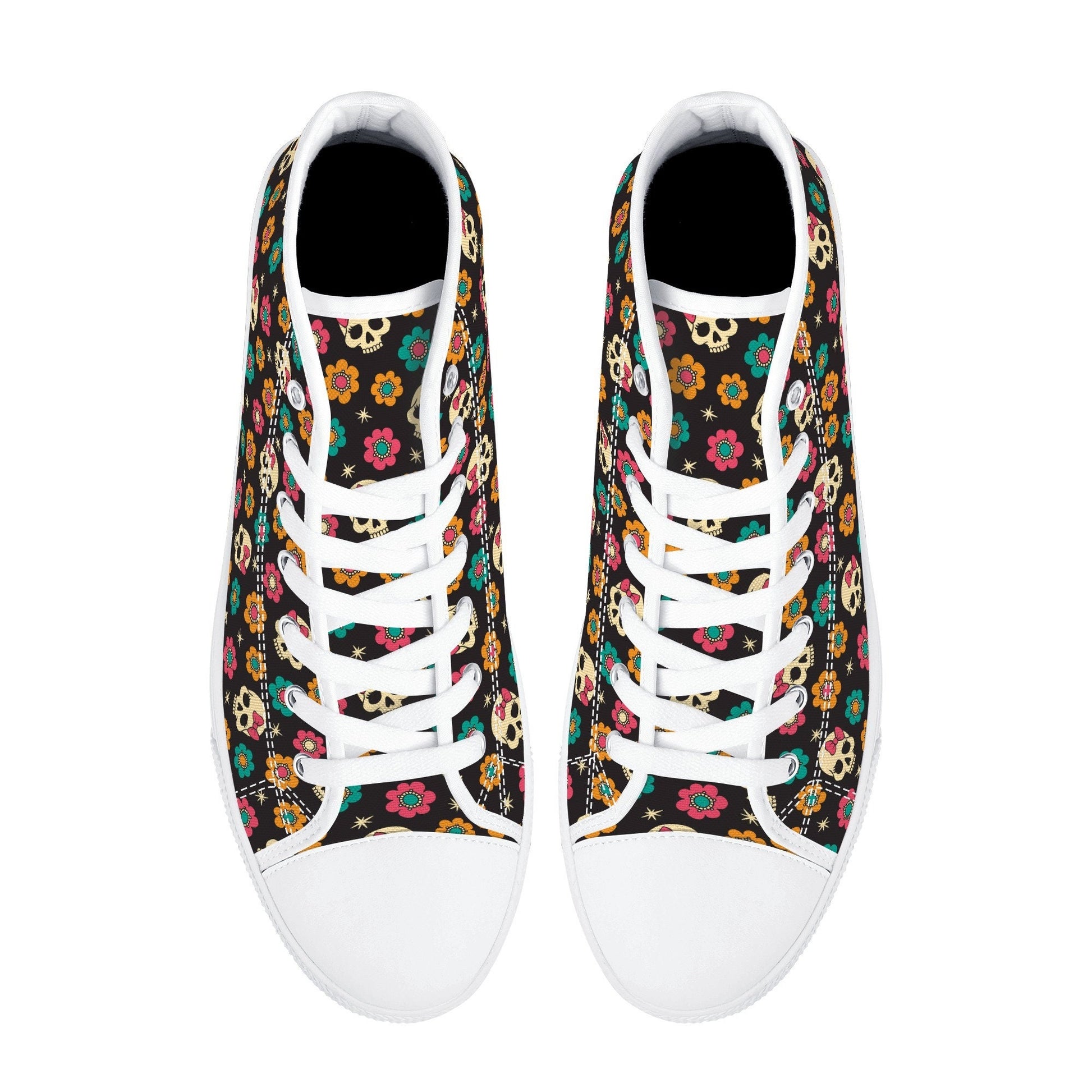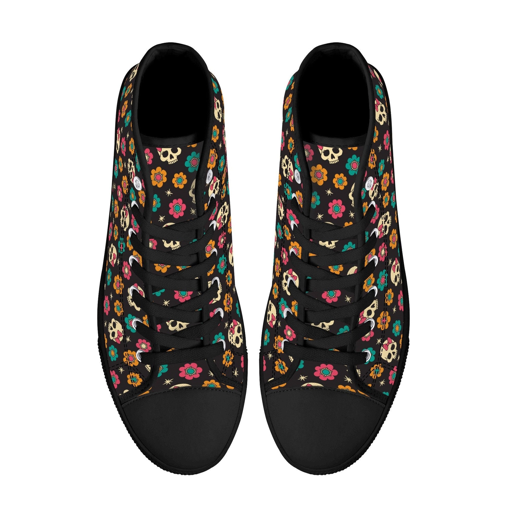 Flower skull shoes, halloween hight top sneakers, punisher skull women sneakers, motorcycle skull high-top shoes, halloween causual shoes