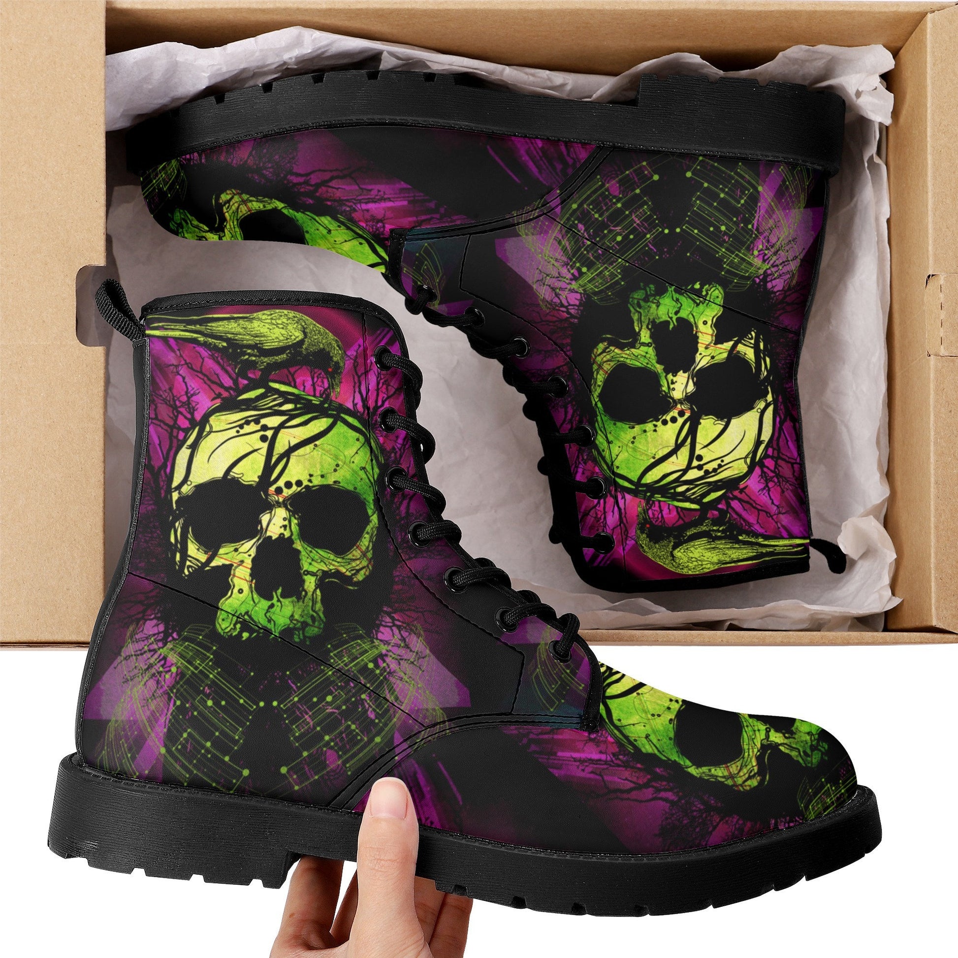 Gothic skull grim reaper boots for men women, Halloween skull gothic women boots skeleton boots, Death grim reaper leather skull boots shoes, Gothic skull grim reaper boots for men women, Goth skull gothic women boots skeleton boots, Halloween grim punisher leather skull boots shoes WOMEN SIZE Size______Foot Length (cm) US5_______23.1cm US5.5_____23.8cm US6_______24.4cm US7_______25.1cm US8_______25.7cm US9_______26.4cm US10______27.0cm US11______27.7cm US11.5____28.3cm US12______29.0cm MEN SIZE Size______Foot Length (cm) US5_______25.1cm US6_______25.7cm US7_______26.2cm US7.5_____27.1cm US8.5_____27.7cm US9.5_____28.3cm US10_______29.0cm US11______29.6cm US12_____30.3cm US13______30.9cm US14______31.6cm High quality eco-friendly synthtic leather material on waterproof boots New style for black gum rubber outsole and black rear pull-loop Breathable EVA foamed insole anti-heat, anti-moisture, anti-corrosion Mesh fabric and foamed lining with lace-up closure for a snug fit Platform measures approx 0.75”for traction and durability A groovy colour explosion for your feet in our signature unisex combat boots Designed for fashion people, stylish and personalized The Upper Made of PU,the sole made of rubber. Soft PU make it comfortable and soft. Two different colors of sole. Rear pull-loop make the boots easy to put on. Season: Autumn, Spring, Winter Occasion: Outdoor, Daily Gender:Women Care Instruction: Spot clean only ======== All products in our store are only manufactured upon receiving an order from the customer. Please carefully review the product description and dimensions in the illustrative images before placing an order. The following cases are not eligible for return/exchange: 1. The product you receive matches the description. 2. The product dimensions (with illustrative images describing the dimensions) you receive match the description. 3. The product has been customized as per your request (e.g., printed with your name/image).