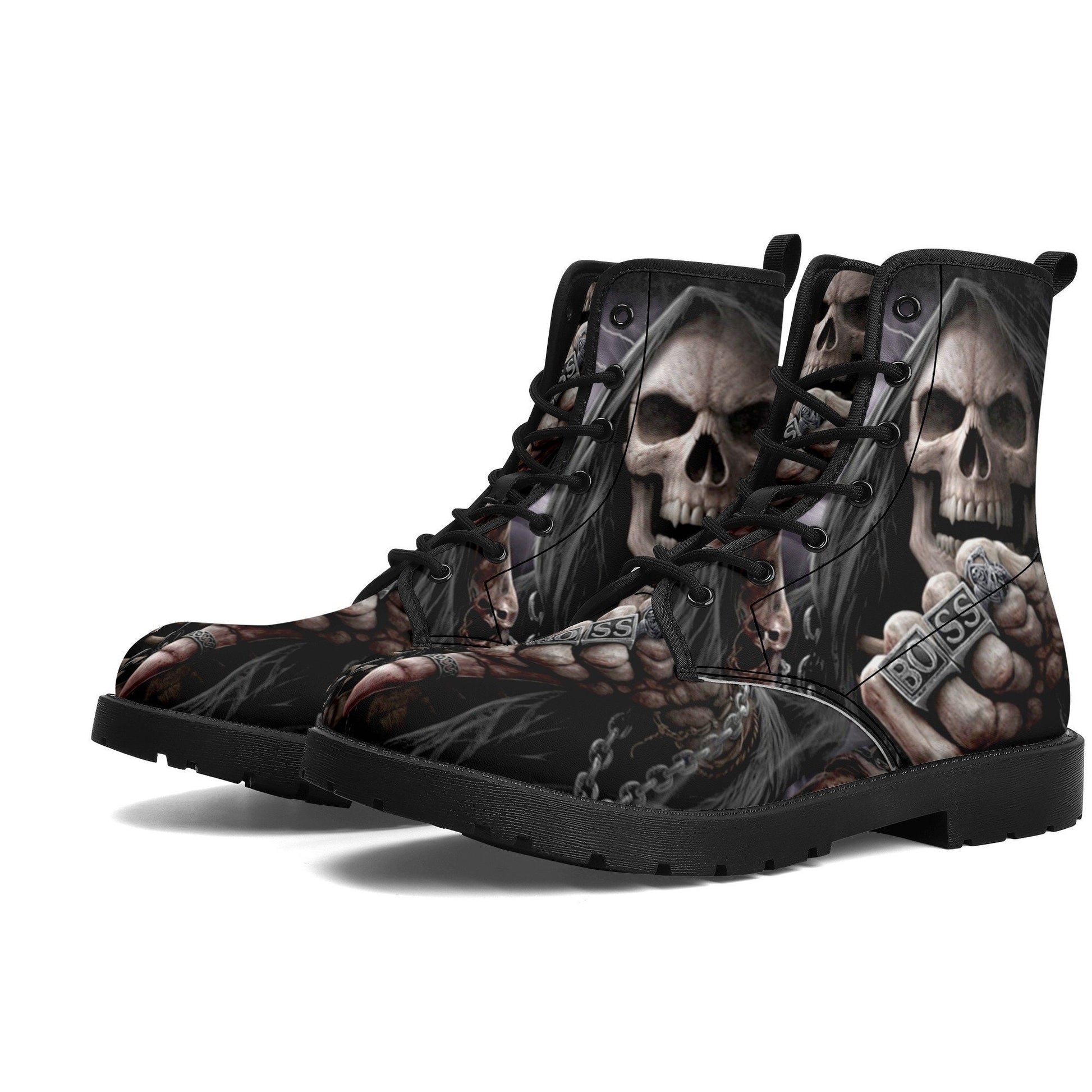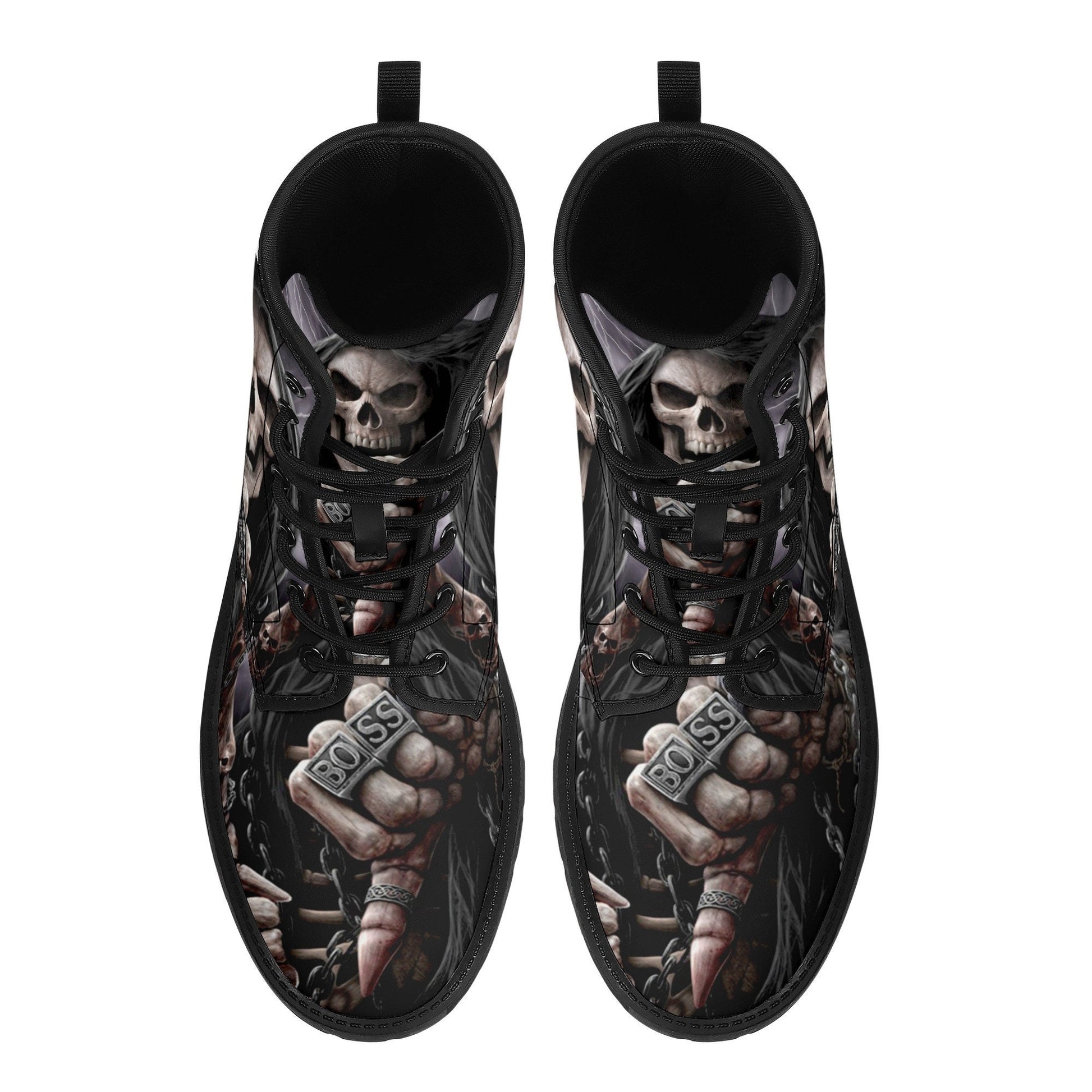Grim reaper BOSS skull boots for men women, Gothic punisher skull women boots skeleton boots, Halloween punisher skulls leather boots shoes