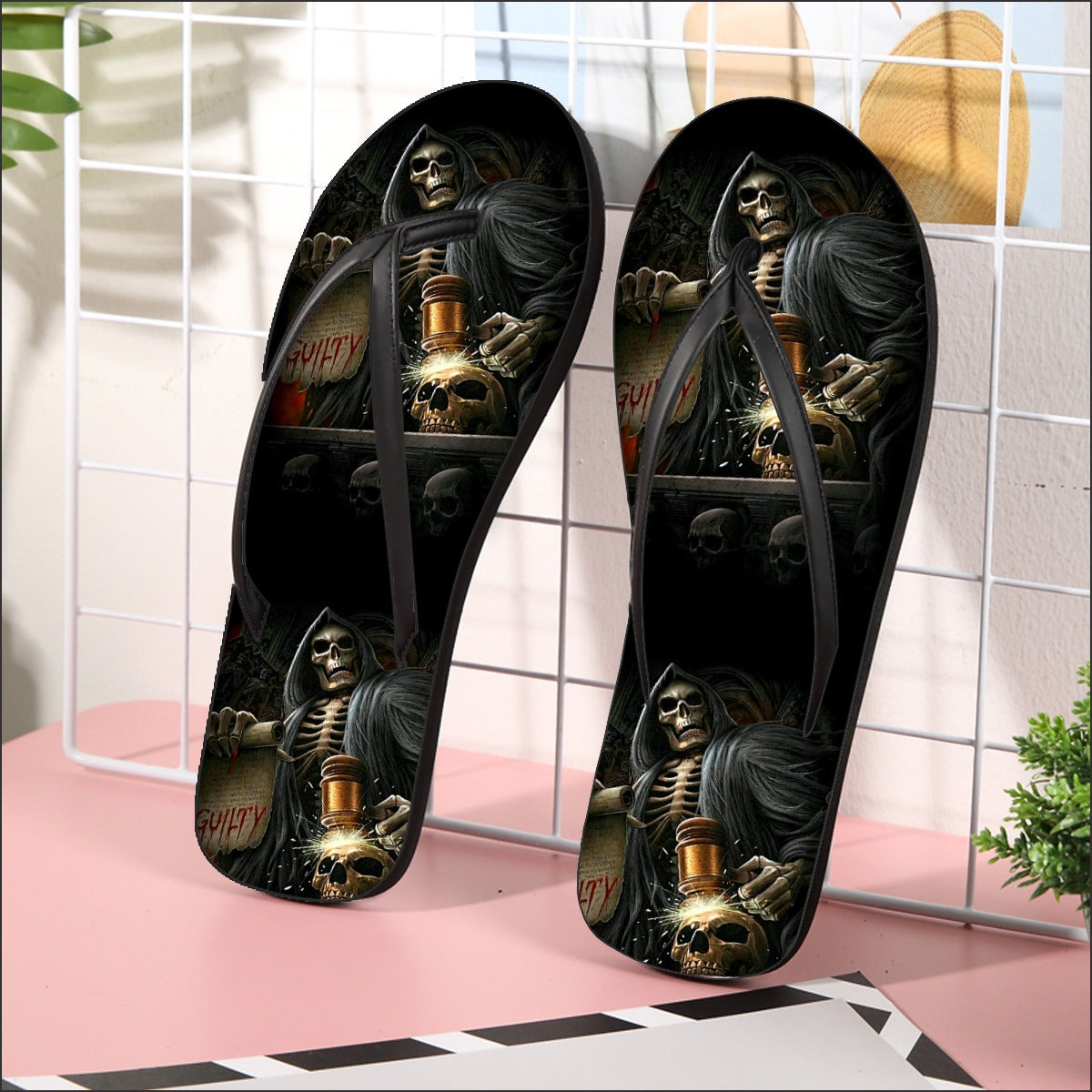 Grim reaper Women's Flip Flops, Skeleton Horror Halloween skull women's sandals flip flops shoes, Day of the dead Women's Flip Flops, Sugar skull women's sandals, Dia de los muertos flip flops