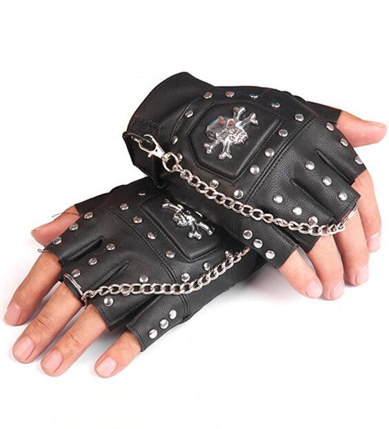 Hip-hop skull gloves personality punk leather gloves chain mens fingerless rivet glove