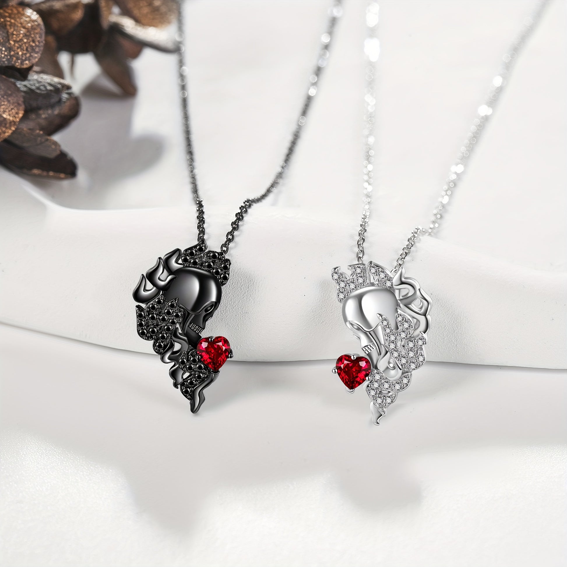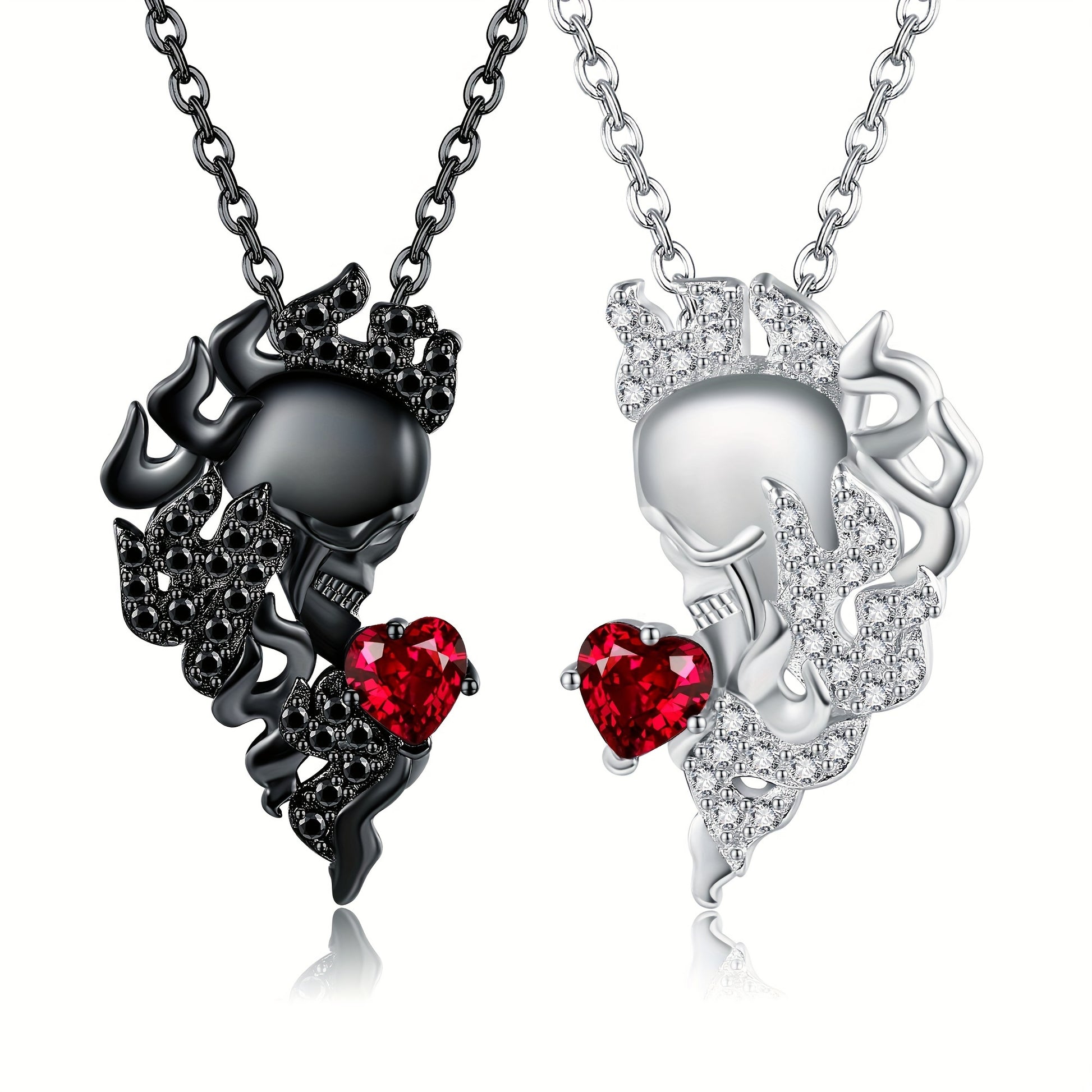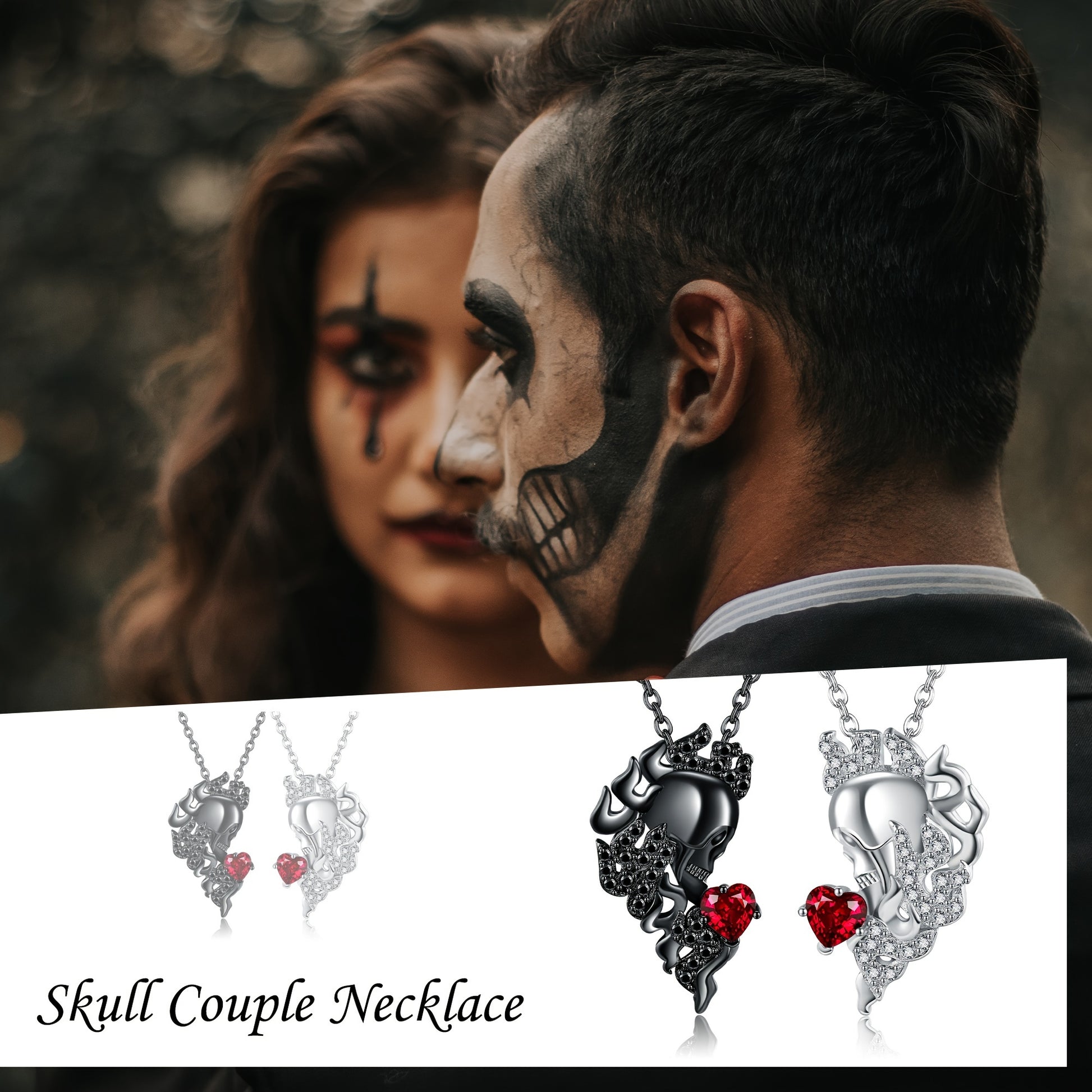 HUKKUN Skull Couple Necklace 925 Sterling Silver His And Hers Matching Necklace Heart Symbol Of Love Pendant Couples Valentine's Day Jewellery Gifts For Couple