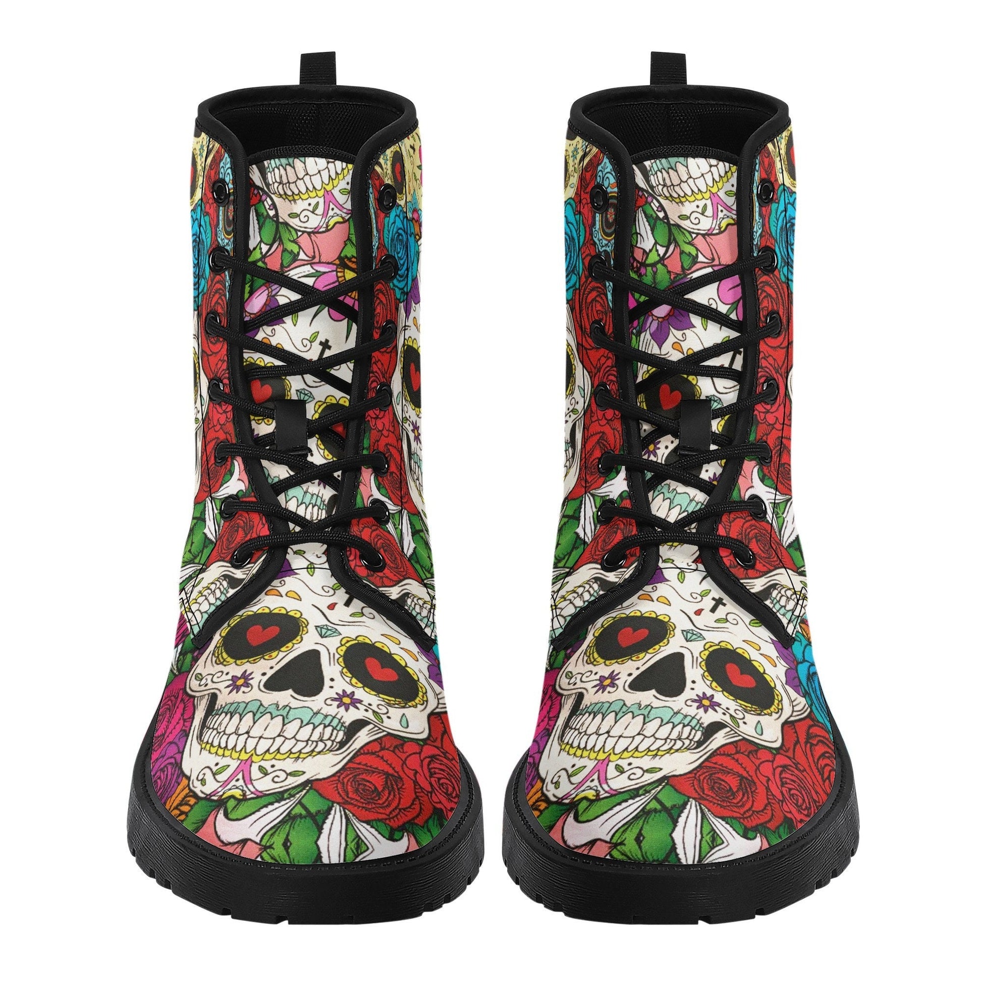Mexico skull day of the dead leather boots, Sugar Calaveras skull boots men women, Dia de los muertos skull boots shoes, Candy skull boots WOMEN SIZE Size______Foot Length (cm) US5_______23.1cm US5.5_____23.8cm US6_______24.4cm US7_______25.1cm US8_______25.7cm US9_______26.4cm US10______27.0cm US11______27.7cm US11.5____28.3cm US12______29.0cm MEN SIZE Size______Foot Length (cm) US5_______25.1cm US6_______25.7cm US7_______26.2cm US7.5_____27.1cm US8.5_____27.7cm US9.5_____28.3cm US10_______29.0cm US11______29.6cm US12_____30.3cm US13______30.9cm US14______31.6cm High quality eco-friendly synthtic leather material on waterproof boots New style for black gum rubber outsole and black rear pull-loop Breathable EVA foamed insole anti-heat, anti-moisture, anti-corrosion Mesh fabric and foamed lining with lace-up closure for a snug fit Platform measures approx 0.75”for traction and durability A groovy colour explosion for your feet in our signature unisex combat boots Designed for fashion people, stylish and personalized The Upper Made of PU,the sole made of rubber. Soft PU make it comfortable and soft. Two different colors of sole. Rear pull-loop make the boots easy to put on. Season: Autumn, Spring, Winter Occasion: Outdoor, Daily Gender:Women Care Instruction: Spot clean only ======== All products in our store are only manufactured upon receiving an order from the customer. Please carefully review the product description and dimensions in the illustrative images before placing an order. The following cases are not eligible for return/exchange: 1. The product you receive matches the description. 2. The product dimensions (with illustrative images describing the dimensions) you receive match the description. 3. The product has been customized as per your request (e.g., printed with your name/image).