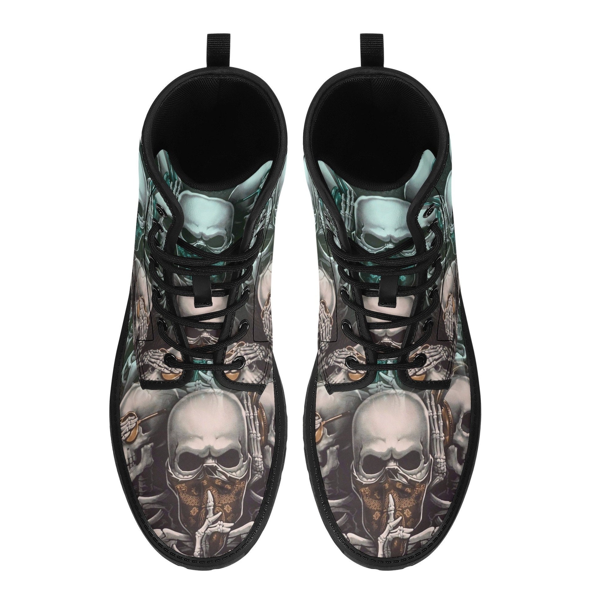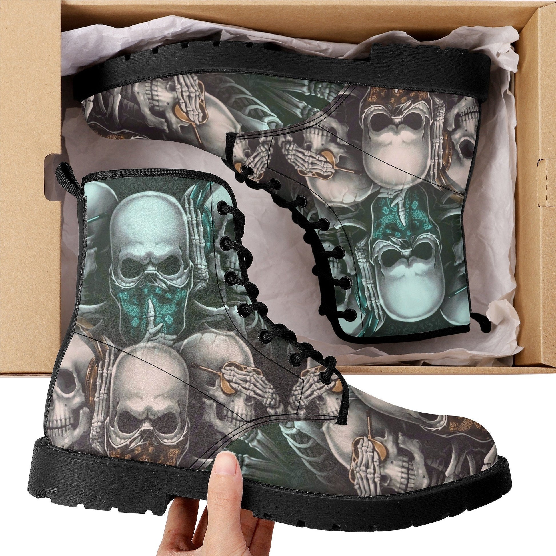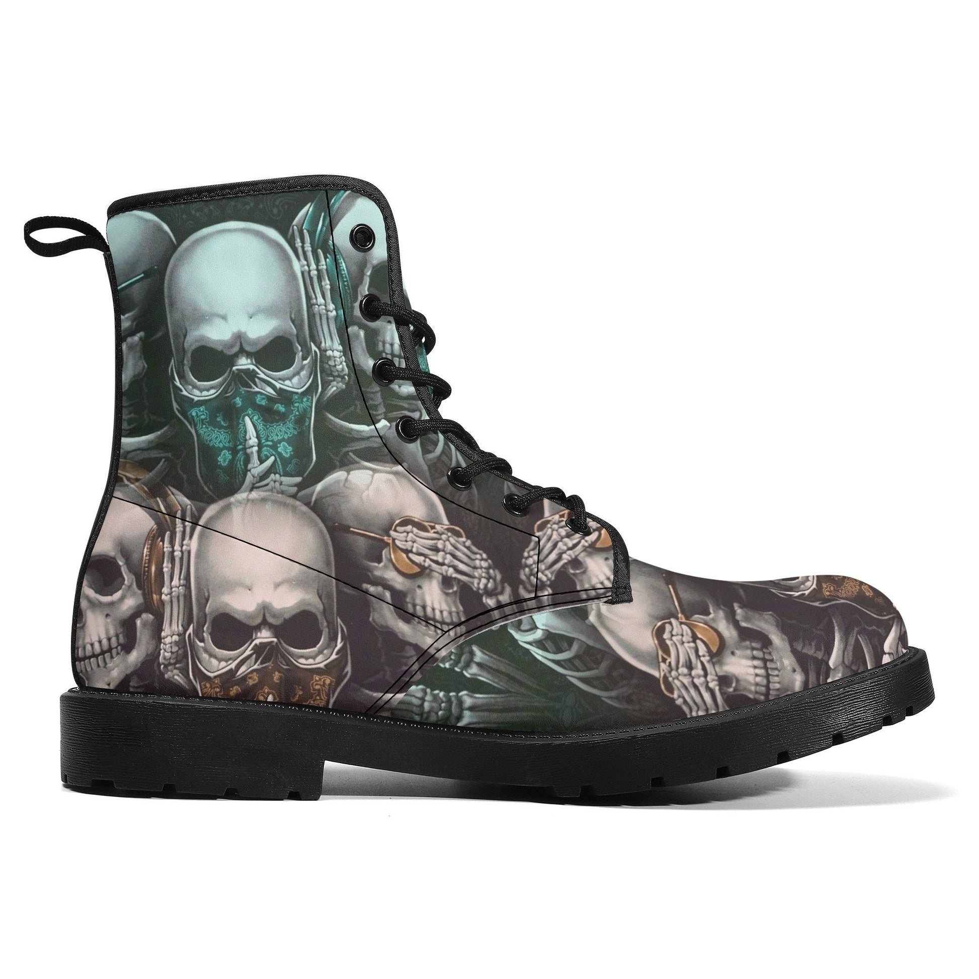 No see no hear no speak skull boots for men women skull gothic men women boots skeleton boots, Halloween Christmas leather skull boots shoes