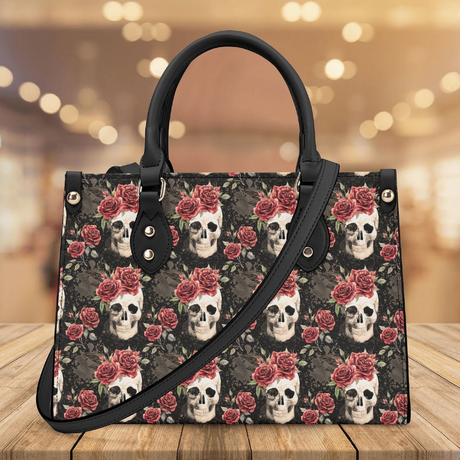 Floral skull shoulder bag, grim reaper women's handbag, punisher skull travel bag, horror crossbody bag, skull with scythes travel bag, motorcycle skull women's purse, biker skull messenger bag, skull in fire crossbody bag, motorcycle skull handbag with strap, flower skull handbag, evil large tote b