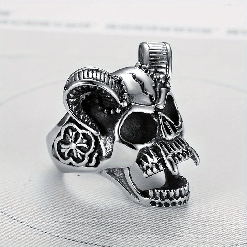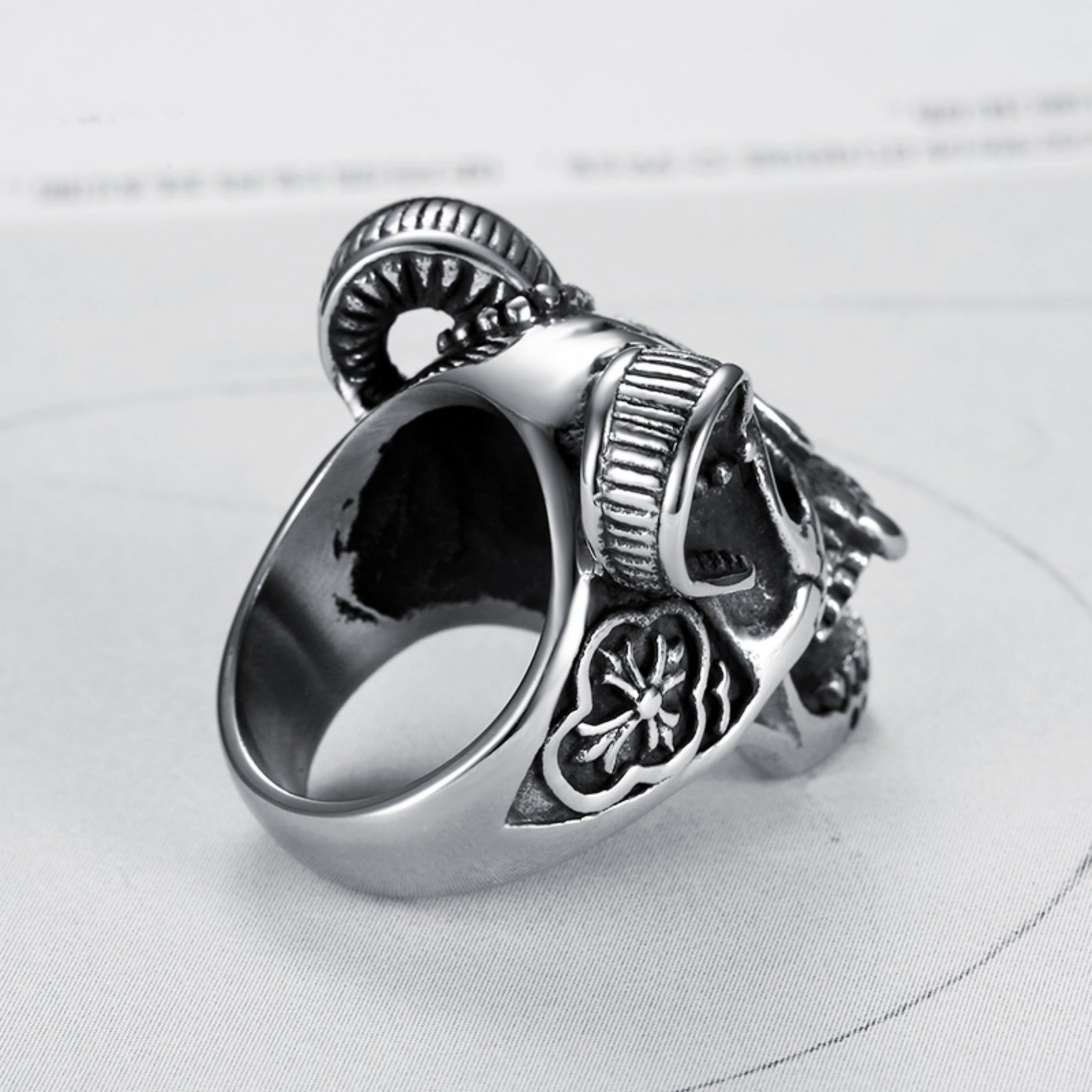 [Silver Stainless Steel Skull Ring] Vintage Silveryy Stainless Steel Sheep Head Skull Ring, European and American Punk Hip-hop Men'S Domineering Jewelry
