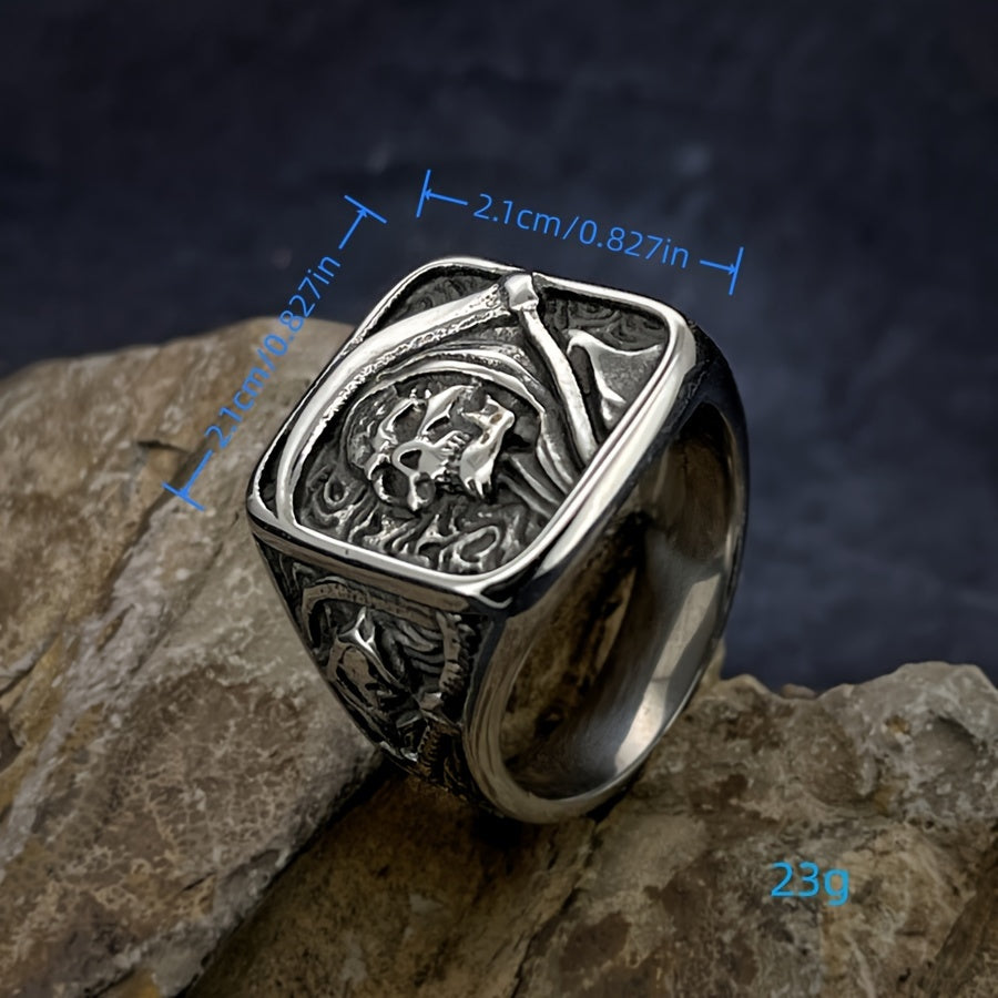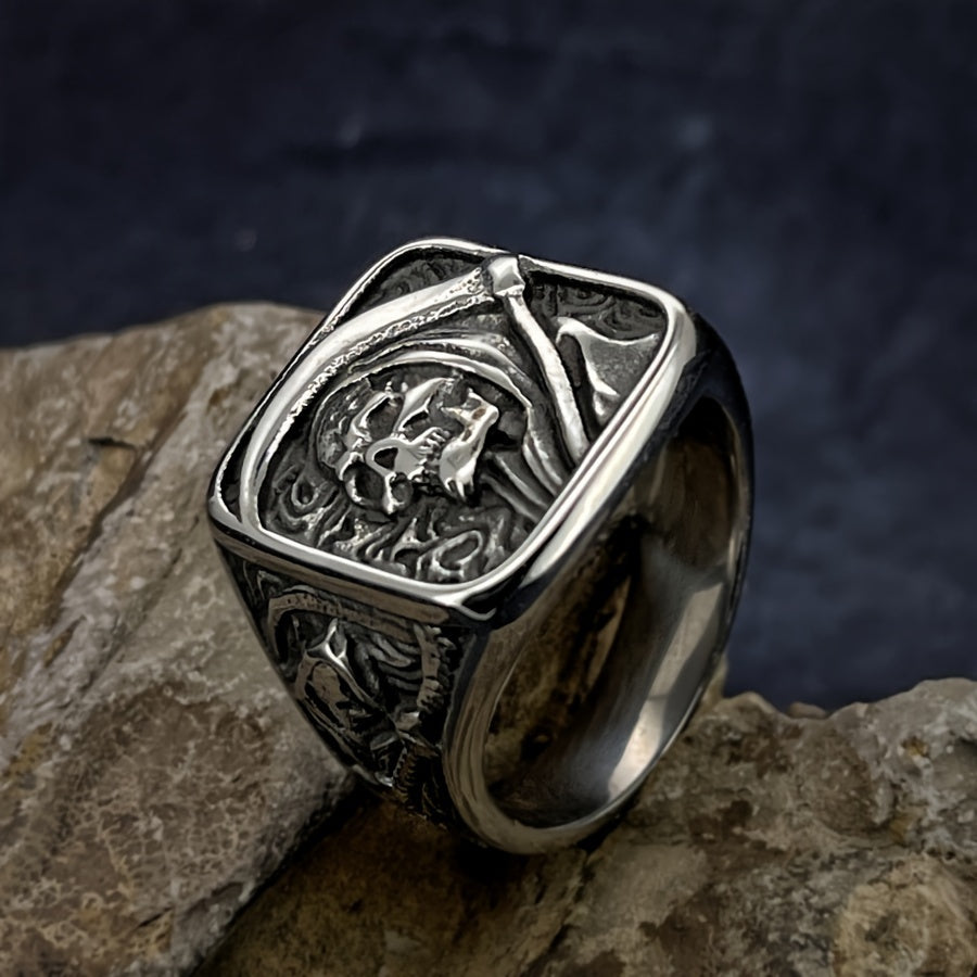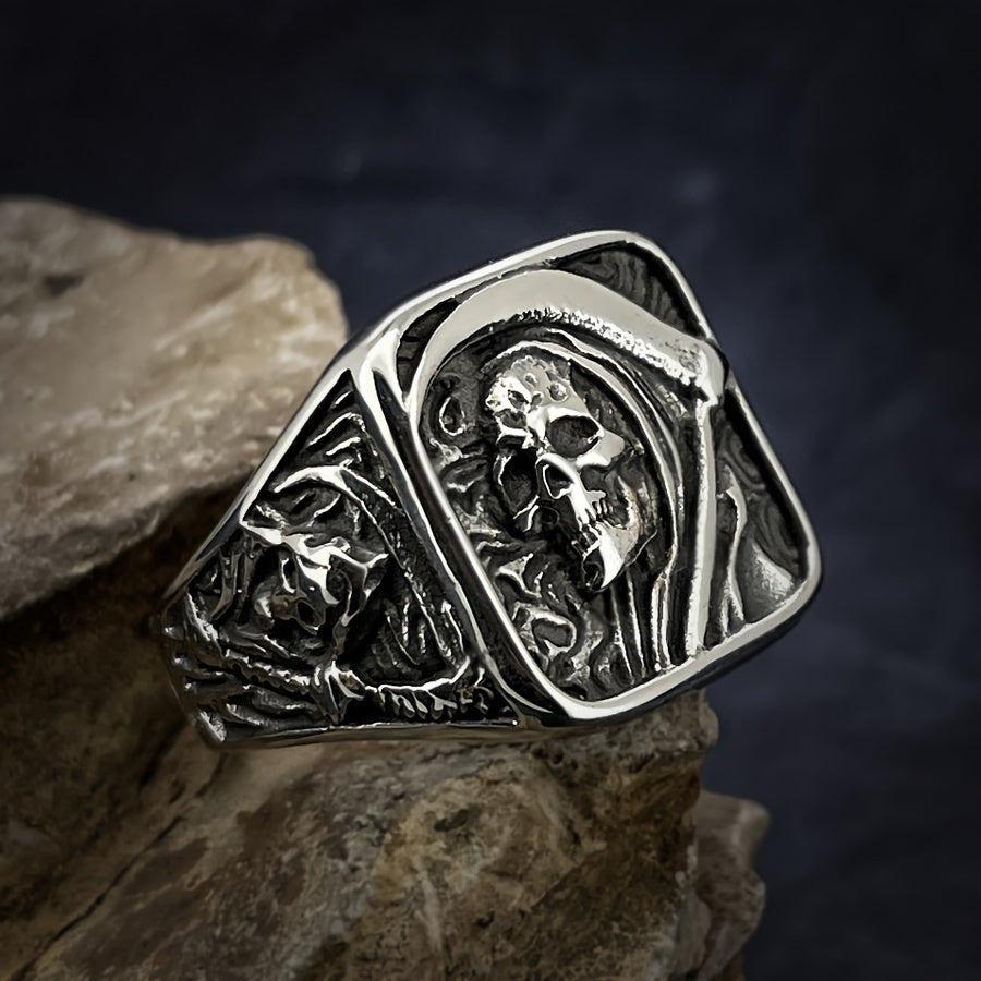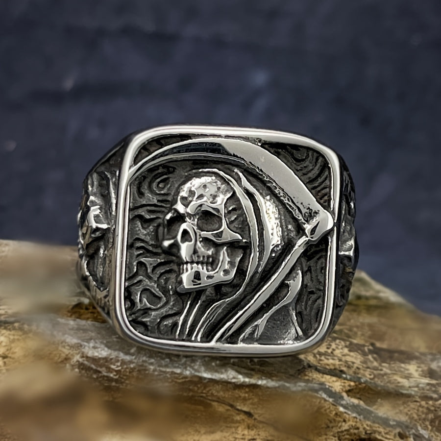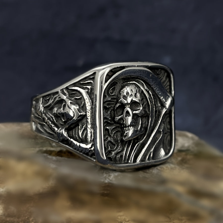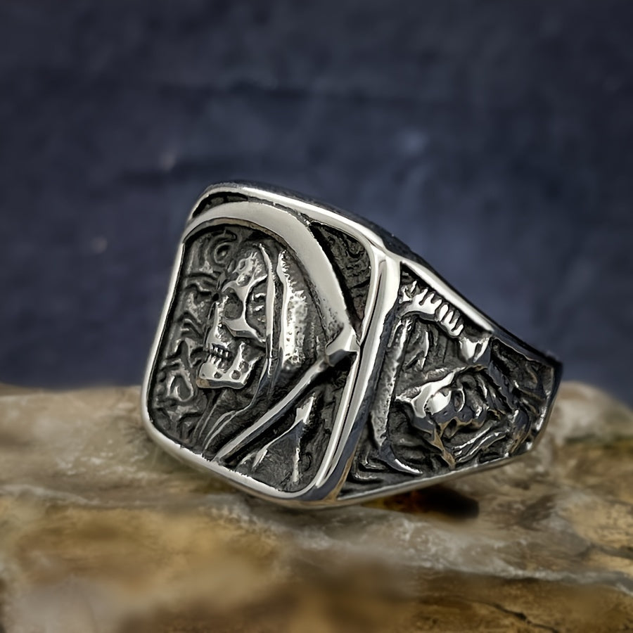 Stainless Steel Men's Ring - Vintage Punk Rock Style with Grim Reaper Skull Design, Single Piece