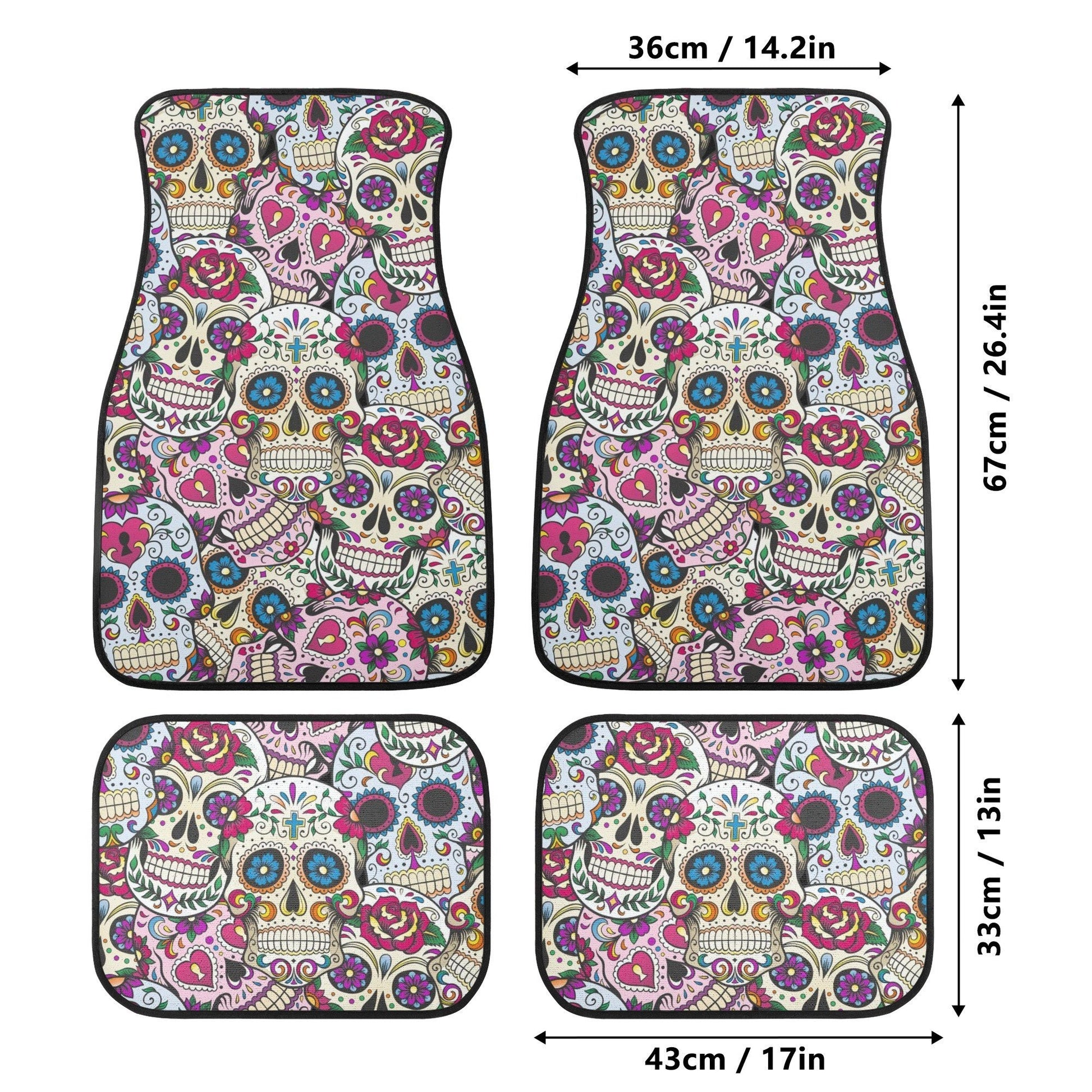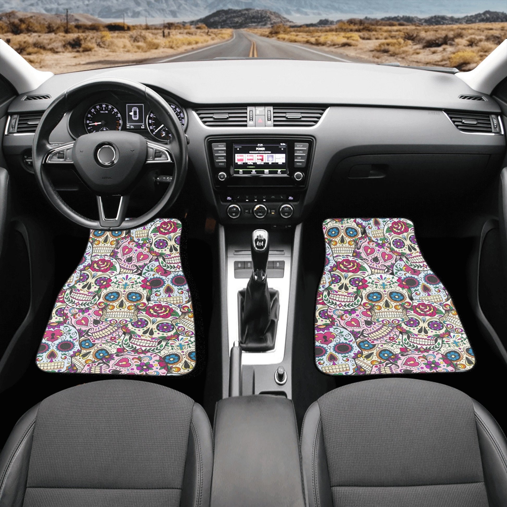 Sugar skull dia de los muertos calaveras Car Seat Covers, day of the dead car mats, sugar skull car accessories, skull car seat covers mats Constructed with high quality polyester micro-fiber fabric for maximum durability and comfort. Add style to your seats while protecting them from spills, stains, tearing, fading and more. Designed for quick and easy installation on most car and SUV bucket style seats - no tools required. Elastic backing and fastening system ensures a snug and secure universal fit on most standard car and SUV seats. Not for use on seats with integrated airbags, seatbelts or armrests. Size: 19 in x 20 in x 31 in x 18 in (please see photo for detail) ==== Car mats All of our Front And Back Car Mats are custom-made-to-order and handcrafted to the highest quality standards. Add style to your car while keeping your floors clean and protected! Features a durable and easy-to-clean custom print constructed from a waterproof polyester material. Rubberized backing with black finished edges ensures a secure grip and skid-free placement. Keep your car floors protected from dirt, spills and daily wear and tear with these stylish custom printed car floor mats! Size: Front mat: 26in x 17in Back mat: 13in x 17 (see detail in product images) ======== All products in our store are only manufactured upon receiving an order from the customer. Please carefully review the product description and dimensions in the illustrative images before placing an order. The following cases are not eligible for return/exchange: 1. The product you receive matches the description. 2. The product dimensions (with illustrative images describing the dimensions) you receive match the description. 3. The product has been customized as per your request (e.g., printed with your name/image).