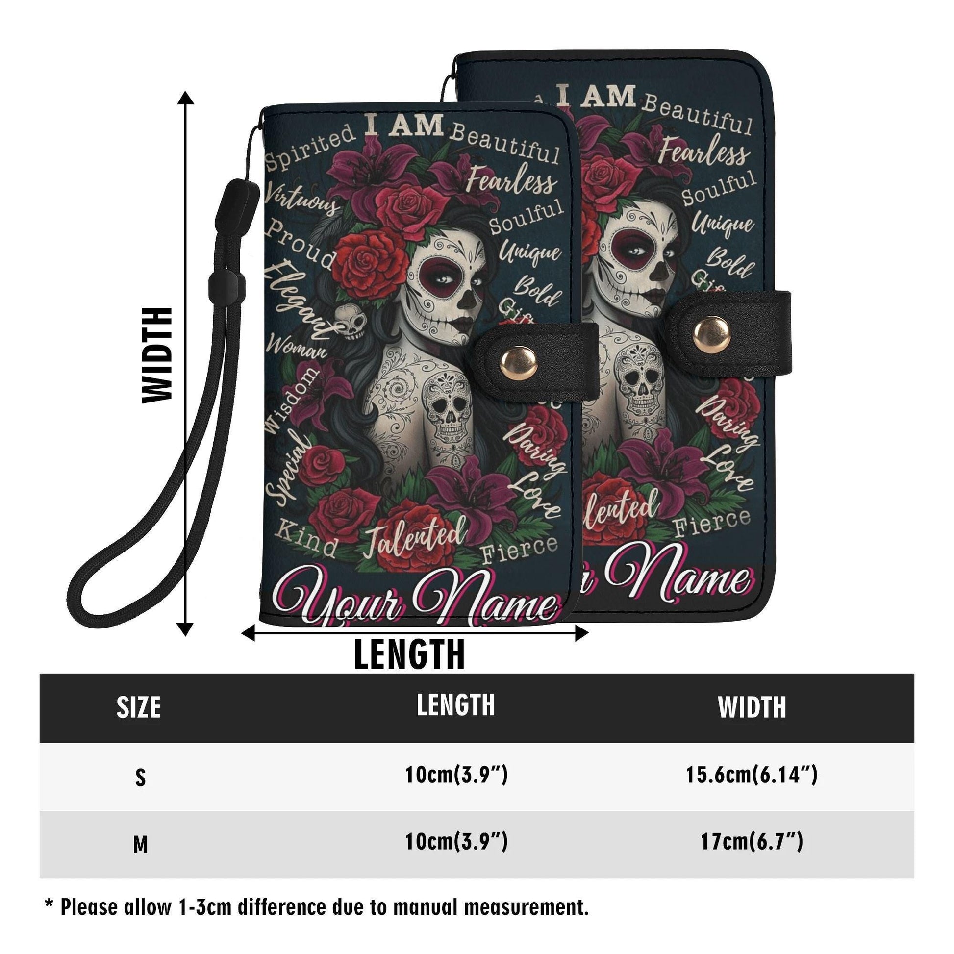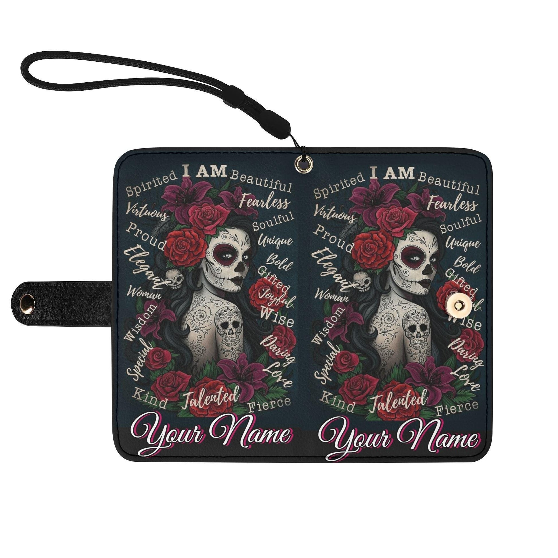 Sugar Skull girl Phone Wallet Case – Custom Name – Candy skull Leather Flip Cover with Card Holder, Dia de los muertos skull Phone Case