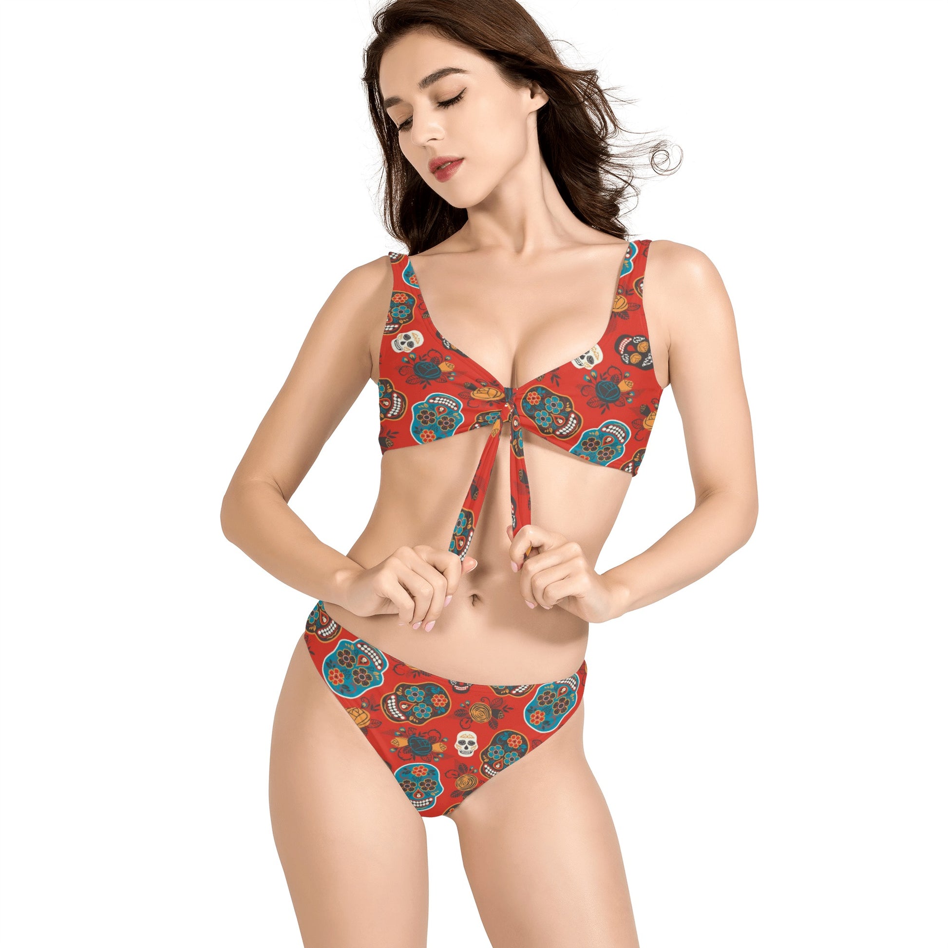 Sugar skull pattern Halloween Women's Bow Front Bikinis Swimsuit