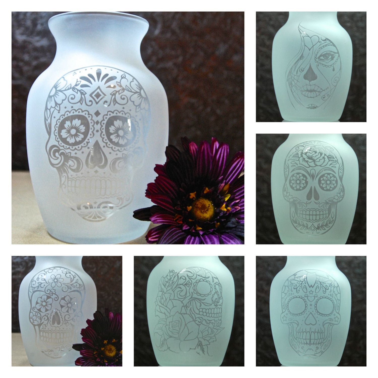• Glass etched sugar skull vase