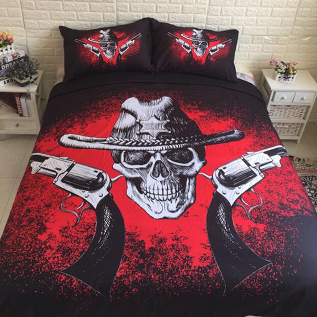3D Skull Bed Sheet Gun Duvet Cover Europe Style Black And Red Queen/King Size