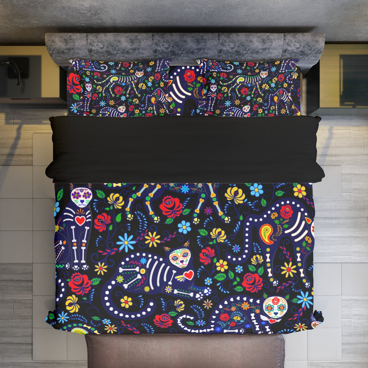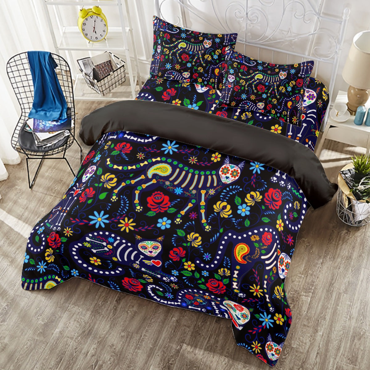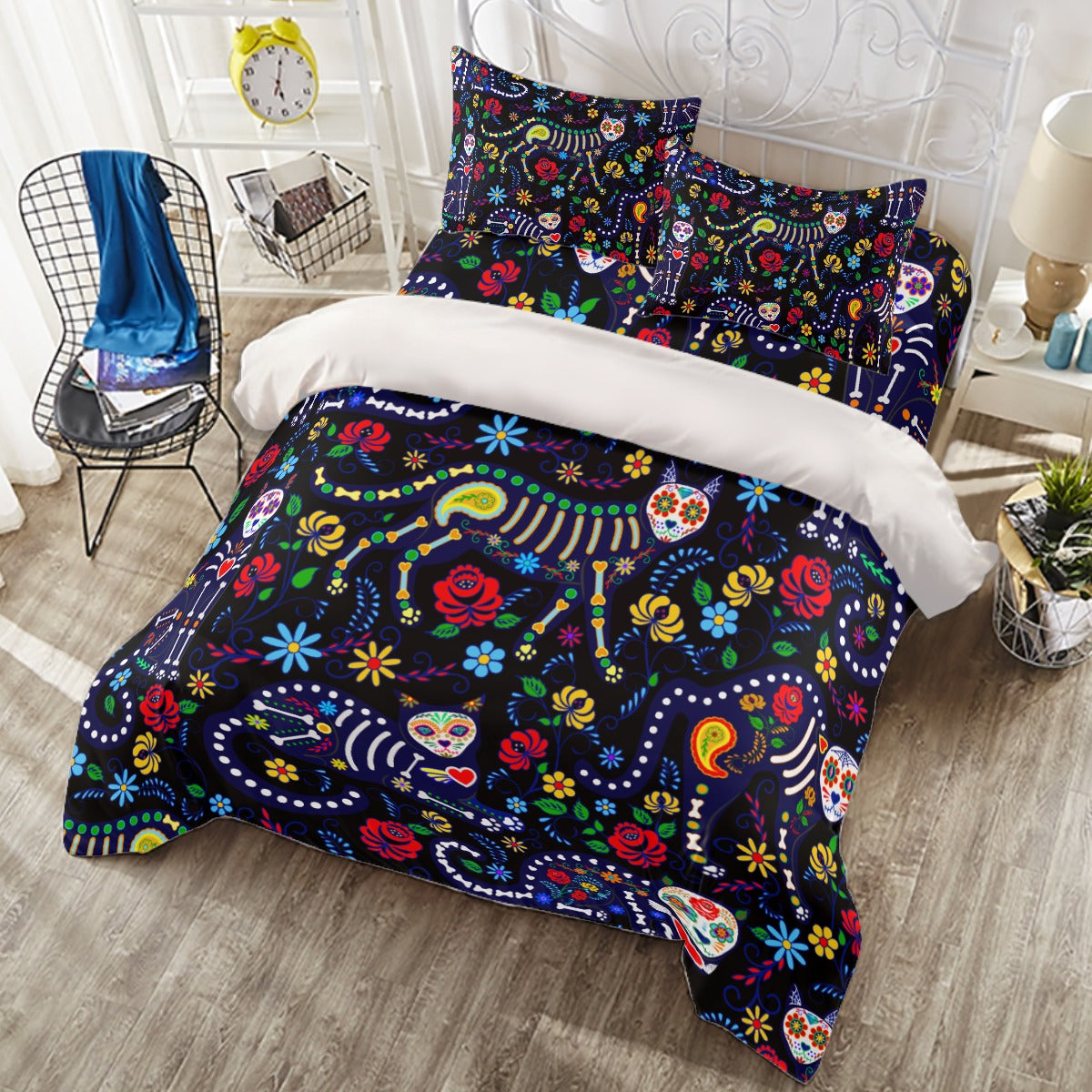 Animal sugar skull cat Four-piece Duvet Cover Set, Sugar skull love Four-piece Duvet Cover Set, Mexican sugar skull dia de los muertos skeleton Four-piece Duvet Cover Set, Gothic sugar skull floral skeleton Four-piece Duvet Cover Set
