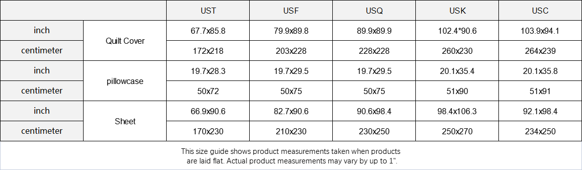| inch | Quilt Cover | 67.7x85.8 | 79.9x89.8 | 89.9x89.9 | 102.4*90.6 | 103.9x94.1 |