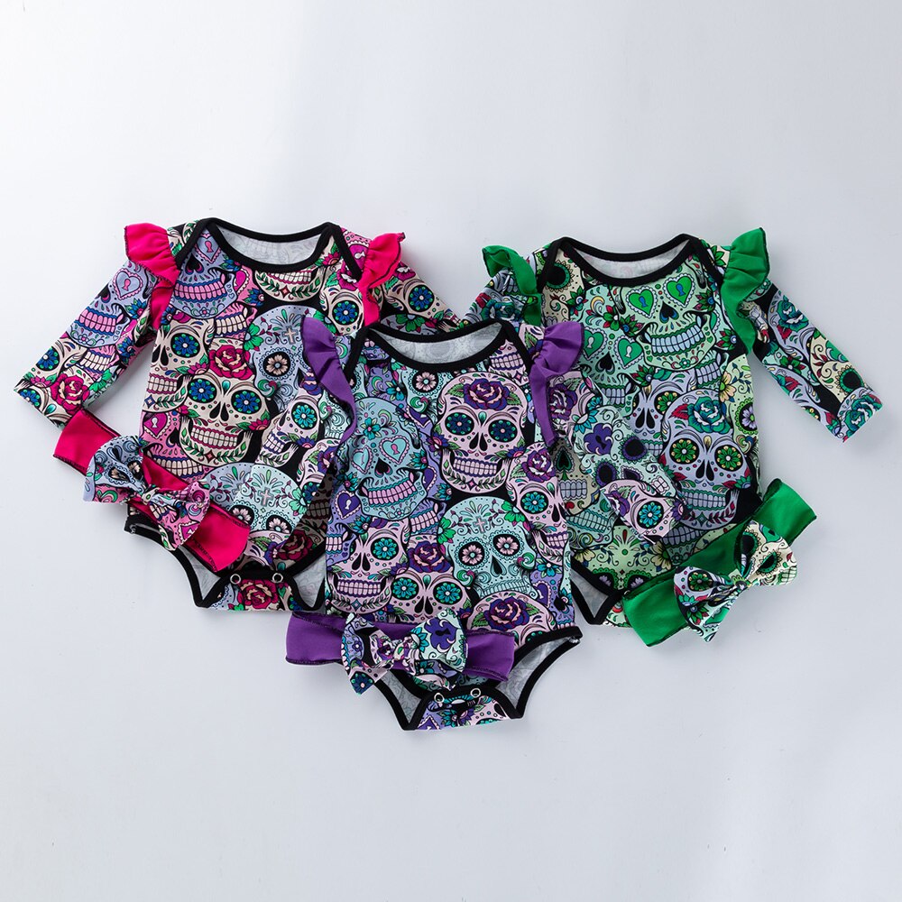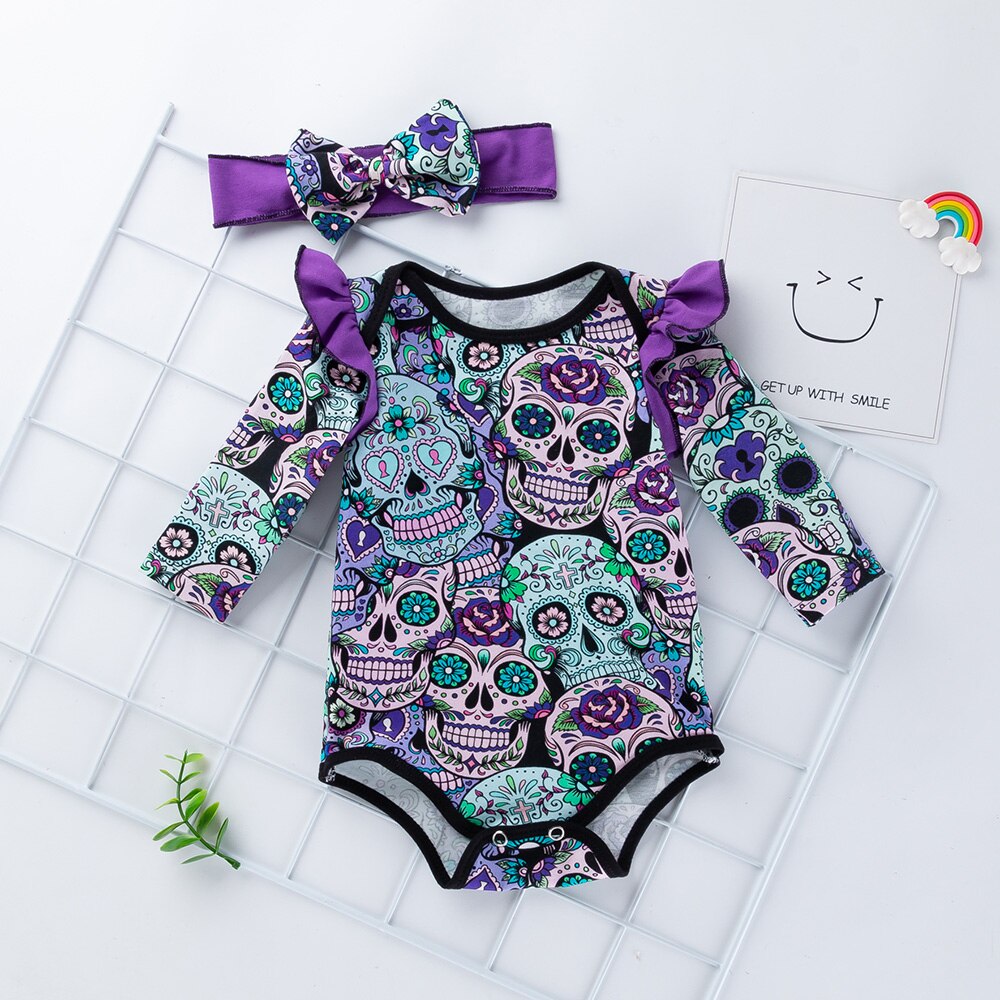 Set of 2 pcs: Baby Girl Boy Bodysuit Long Sleeve Skull Print Newborn Infant Suit & Headband
