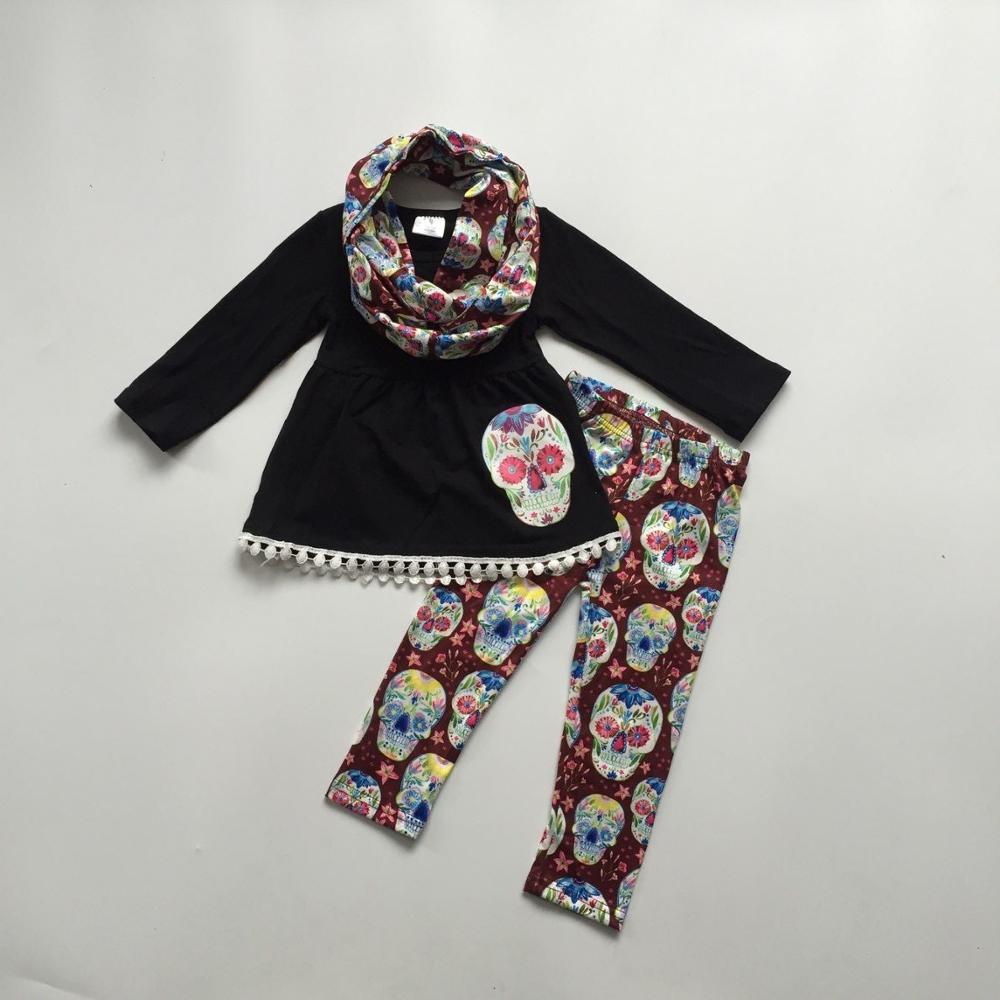 baby girls skull print clothes FALL OUTFITS girls 3 pieces with scarf sets girls floral outfits black dress with skull pants