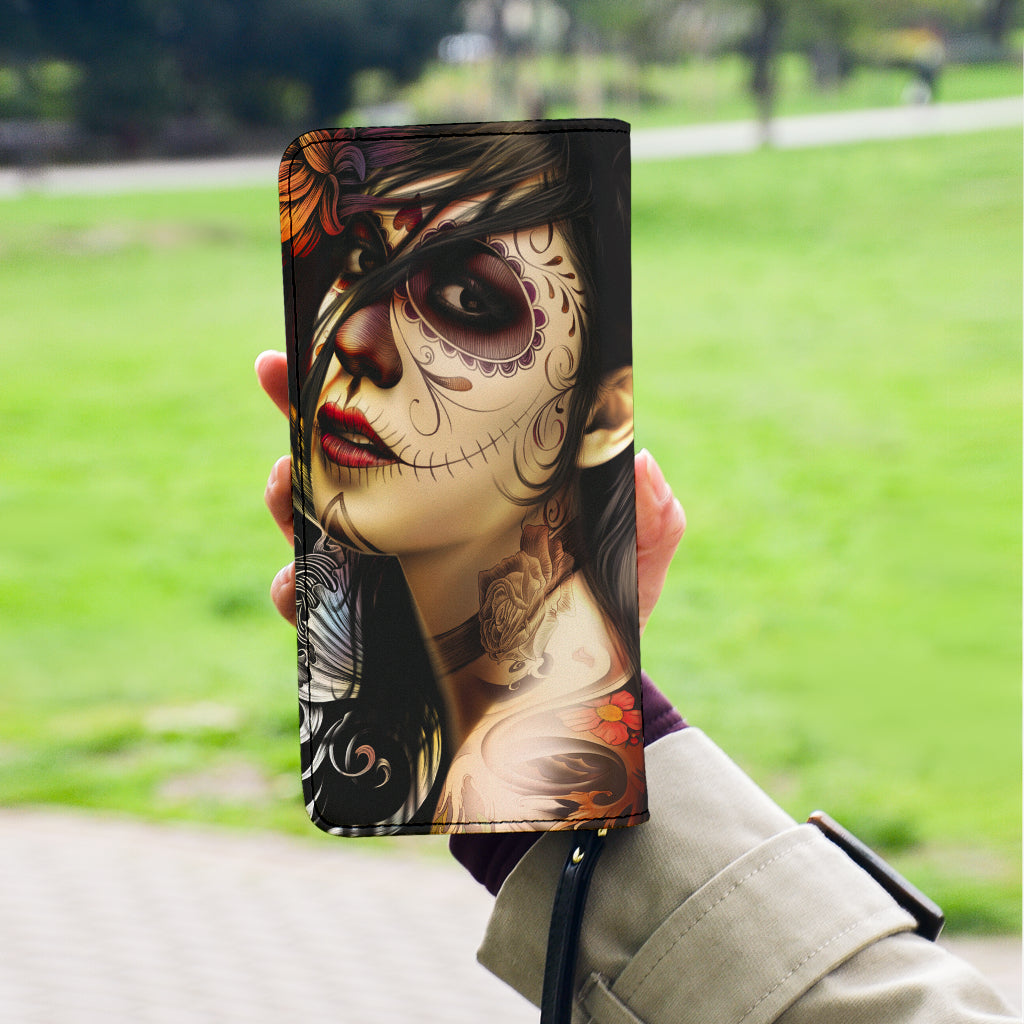 - Finished with a zip closure for easy access and a convenient wristlet strap.