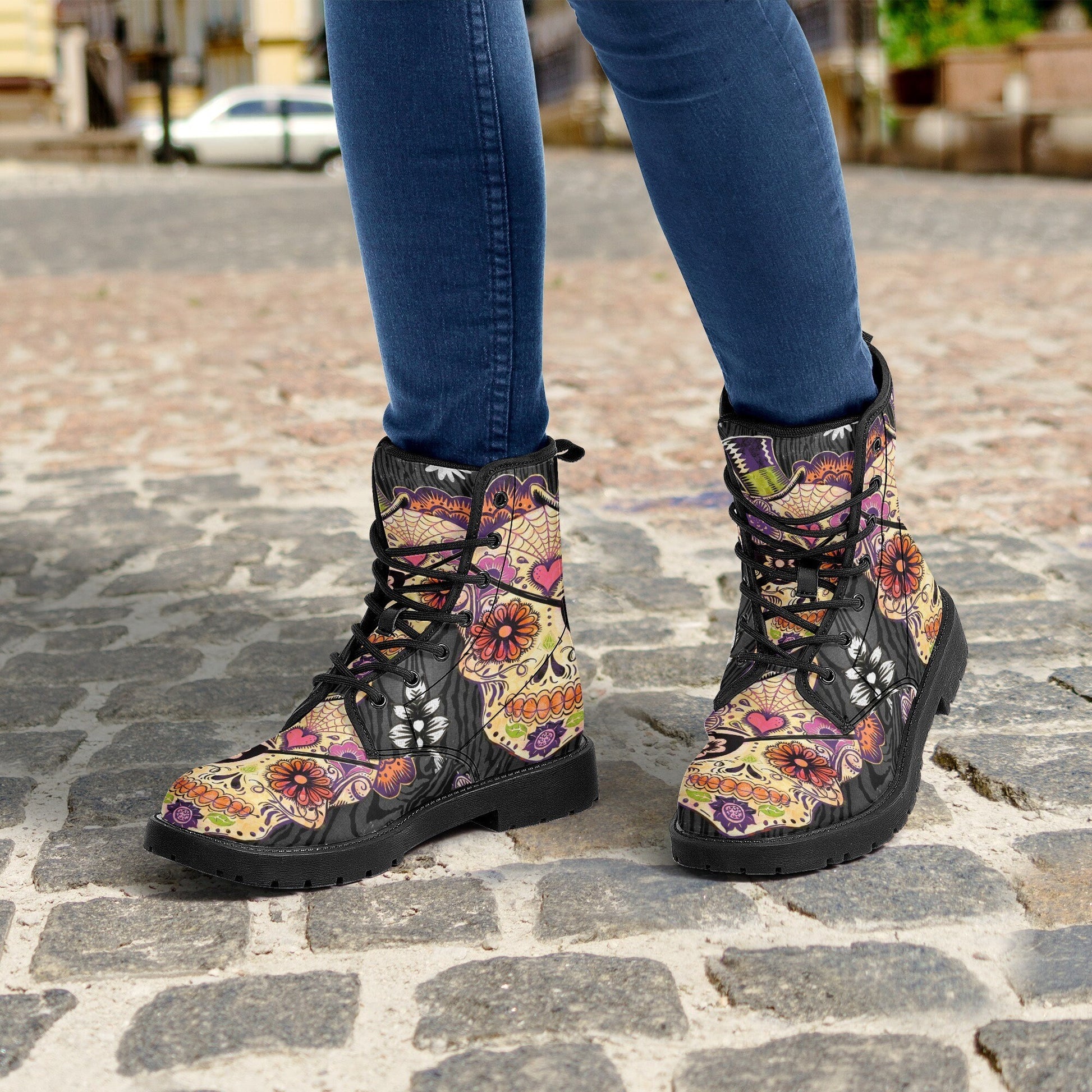 Sugar skull shoes, cinco de mayo skull boots for men women, day of the dead waterproof boot, cinco de mayo skull waterproof Lace Up Anti-Slip platform nooties, candy skull waterproof boot, sugar skull girl winter boots, floral skull ankle boots WOMEN SIZE Size______Foot Length (cm) US5_______23.1cm US5.5_____23.8cm US6_______24.4cm US7_______25.1cm US8_______25.7cm US9_______26.4cm US10______27.0cm US11______27.7cm US11.5____28.3cm US12______29.0cm MEN SIZE Size______Foot Length (cm) US5_______25.1cm US6_______25.7cm US7_______26.2cm US7.5_____27.1cm US8.5_____27.7cm US9.5_____28.3cm US10_______29.0cm US11______29.6cm US12_____30.3cm US13______30.9cm US14______31.6cm High quality eco-friendly synthtic leather material on waterproof boots New style for black gum rubber outsole and black rear pull-loop Breathable EVA foamed insole anti-heat, anti-moisture, anti-corrosion Mesh fabric and foamed lining with lace-up closure for a snug fit Platform measures approx 0.75”for traction and durability A groovy colour explosion for your feet in our signature unisex combat boots Designed for fashion people, stylish and personalized The Upper Made of PU,the sole made of rubber. Soft PU make it comfortable and soft. Two different colors of sole. Rear pull-loop make the boots easy to put on. Season: Autumn, Spring, Winter Occasion: Outdoor, Daily Gender:Women Care Instruction: Spot clean only ======== All products in our store are only manufactured upon receiving an order from the customer. Please carefully review the product description and dimensions in the illustrative images before placing an order. The following cases are not eligible for return/exchange: 1. The product you receive matches the description. 2. The product dimensions (with illustrative images describing the dimensions) you receive match the description. 3. The product has been customized as per your request (e.g., printed with your name/image).