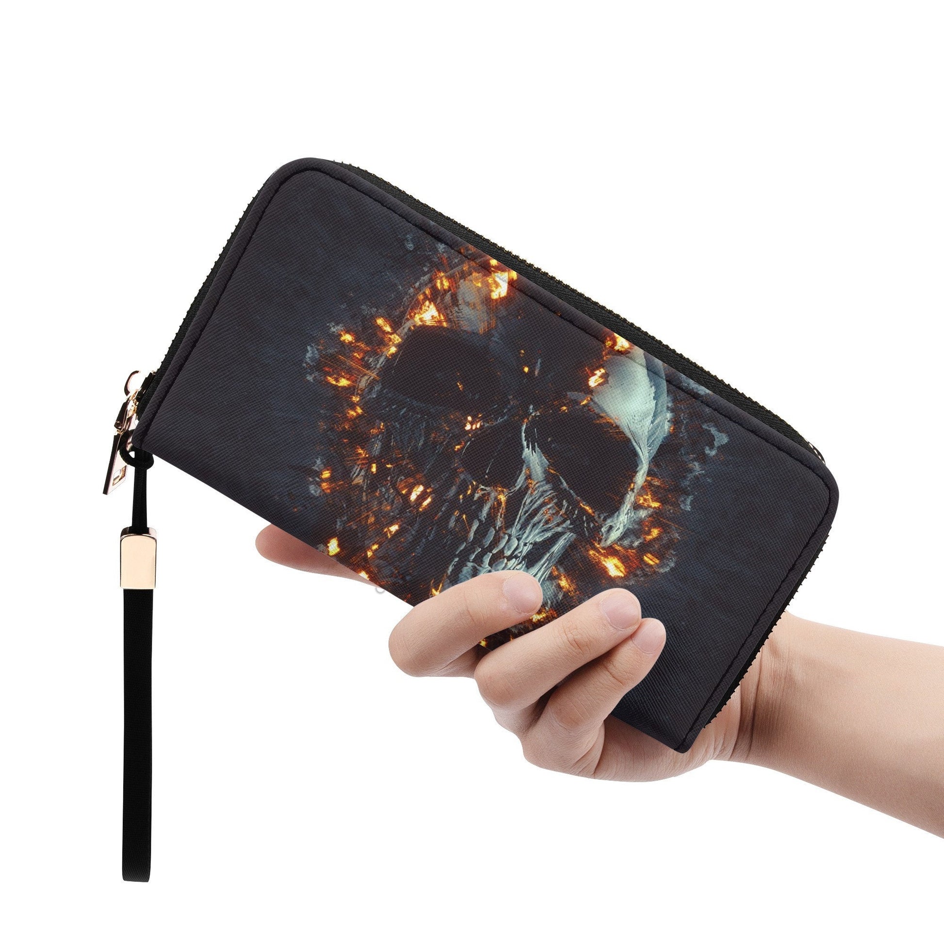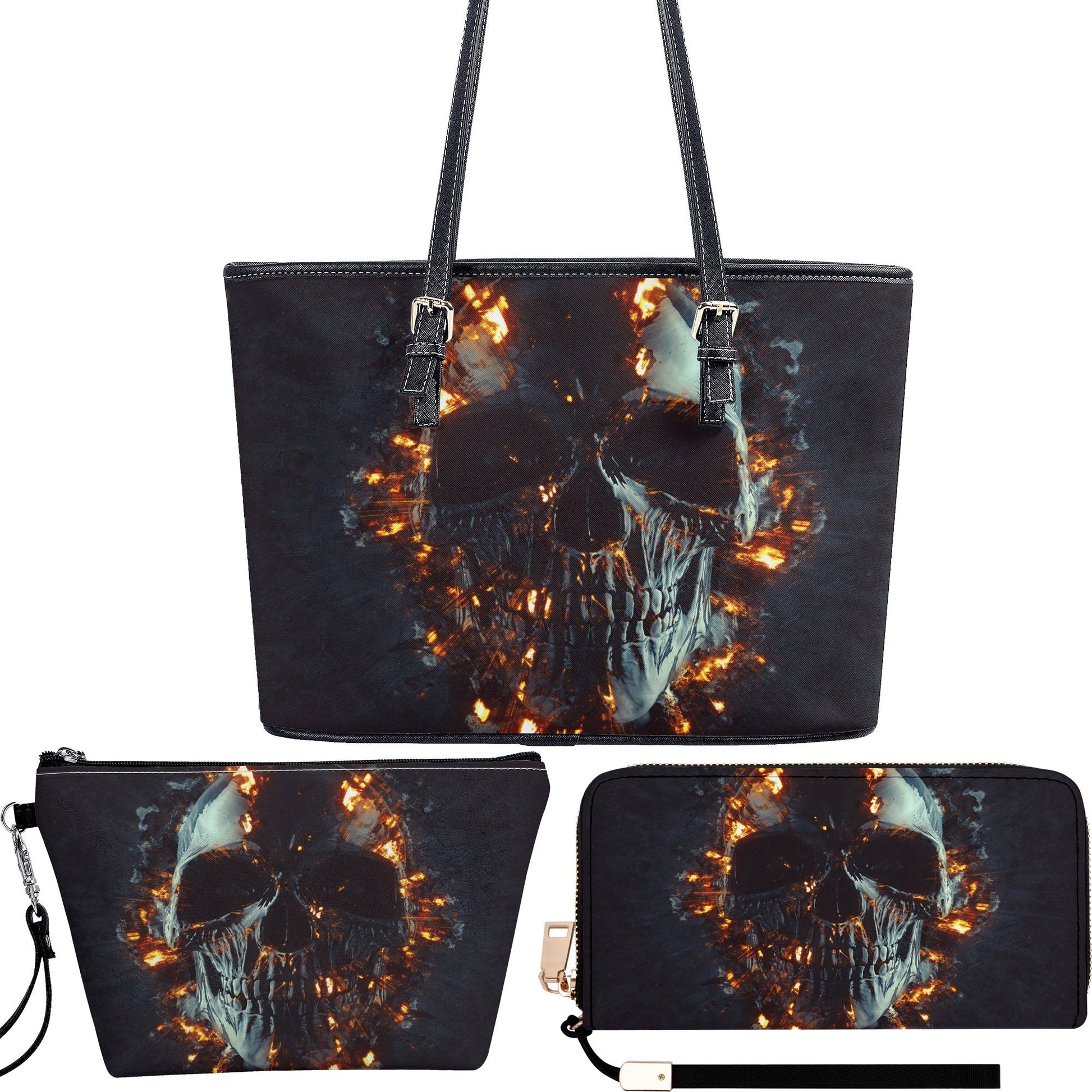 Flaming skull tote bag, flaming skull wallet, skull in fire cosmetic wallet, flaming skull cosmetic bag, flaming skull long wallet, grim reaper travel bag, horror wallet, grim reaper crossbody bag, skull crossbody bag, skull in fire cosmetic bags