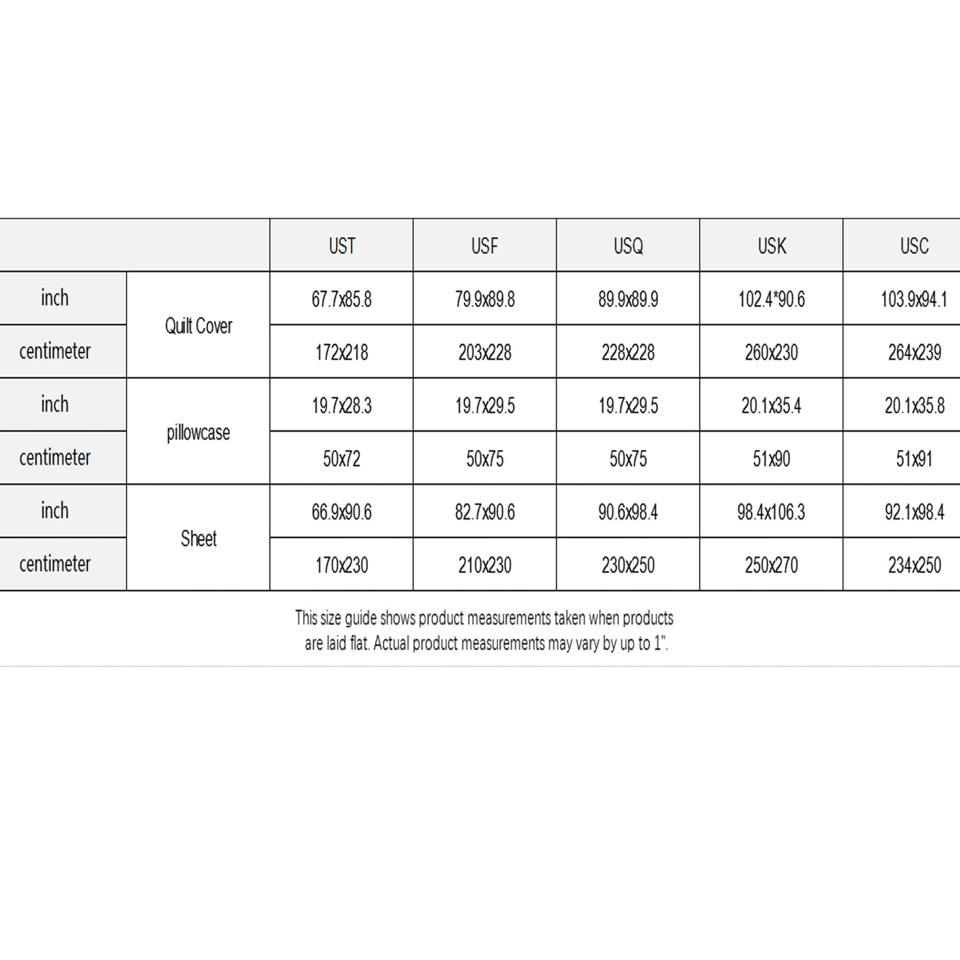 pillowcase______19.7x28.3___19.7x29.5____19.7x29.5_____20.1x35.4____20.1x35.8