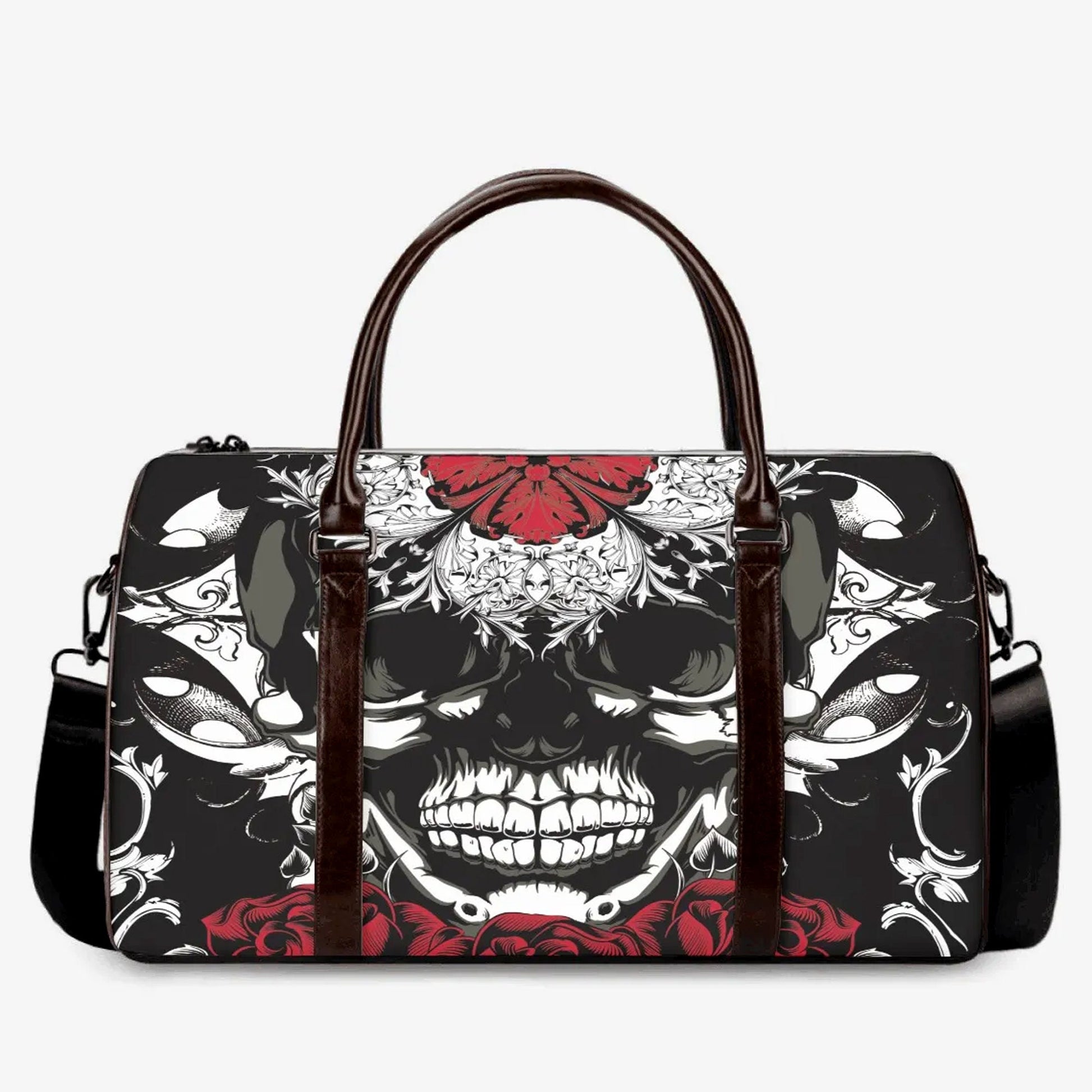 Floral skull Vacation Holidays Travel Bag, rose skull monogrammed bag, horror Hospital Bag, flame skull weekender bags, evil weekender bags, flower skull shoulder bag, flaming skull Overnight Bag, goth large travel bag, christmas skull bag