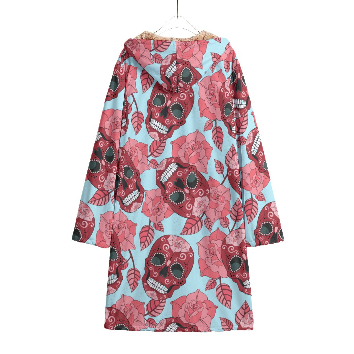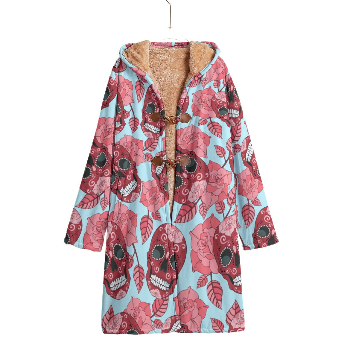 Floral sugar skull claveras mexican skull cloak Horn Button Long Fleece Windbreaker