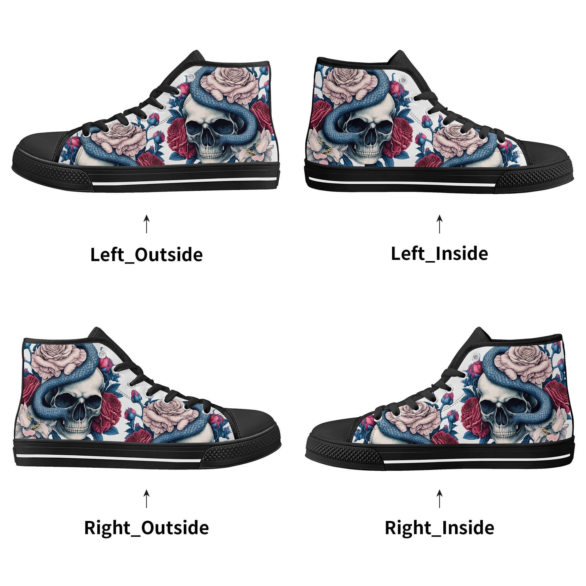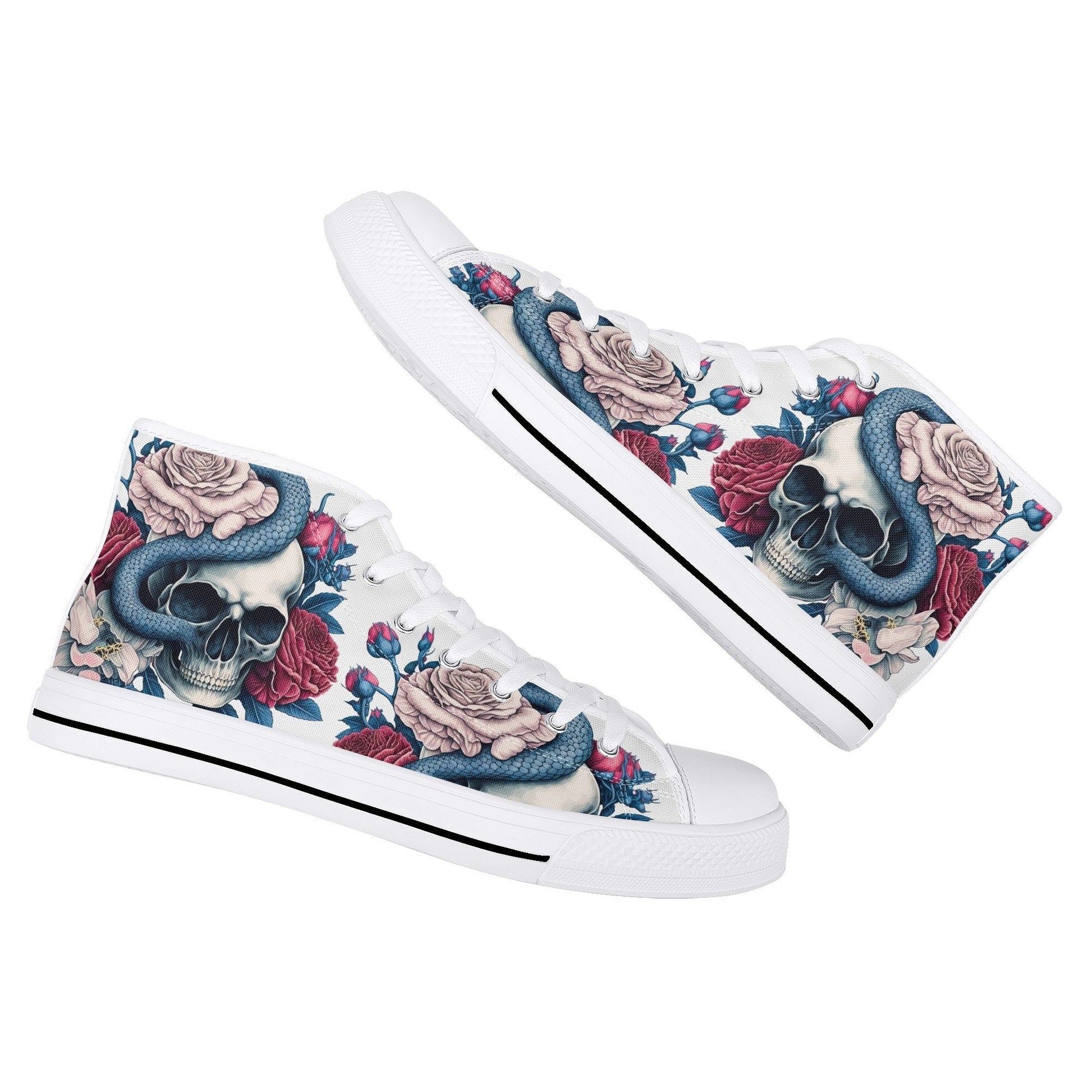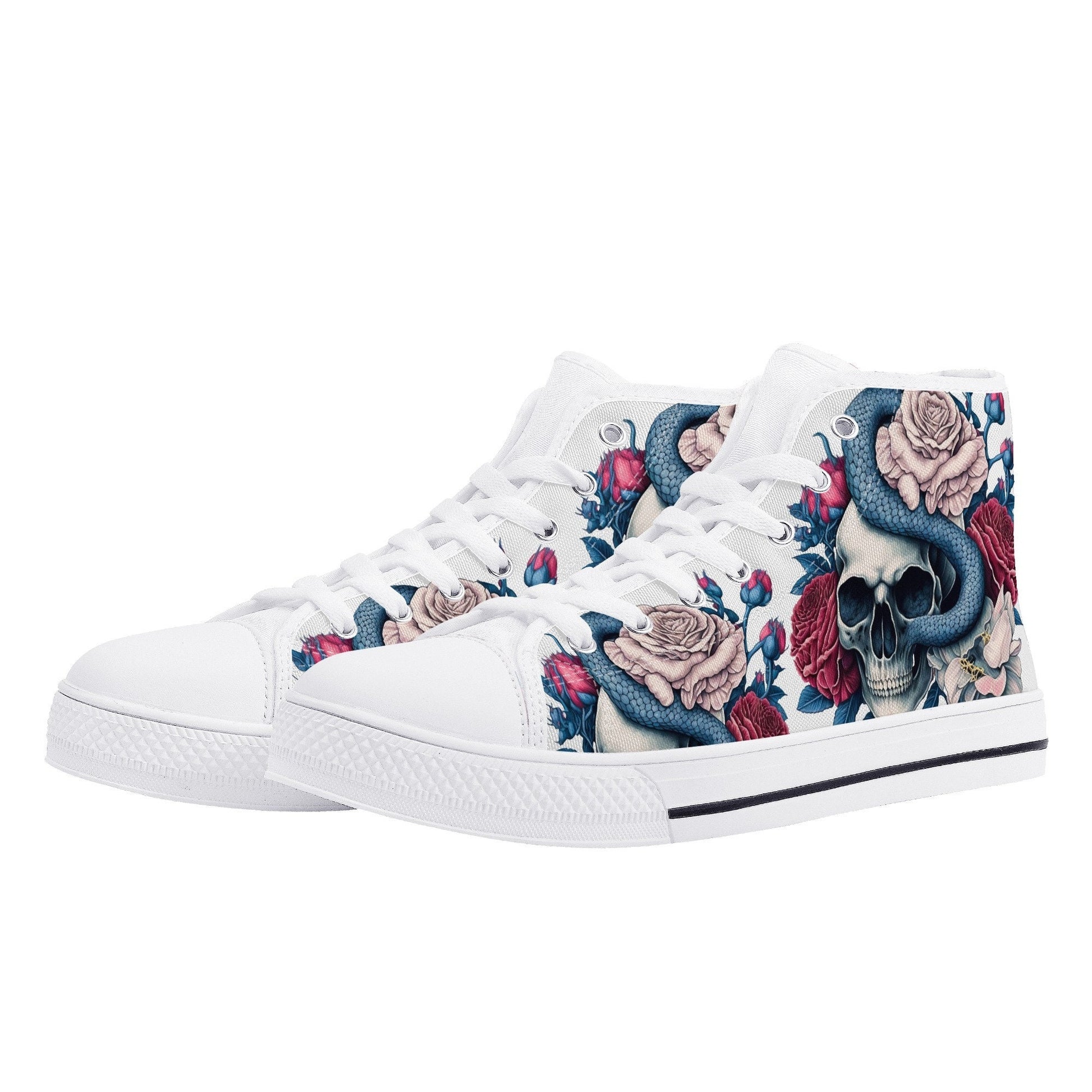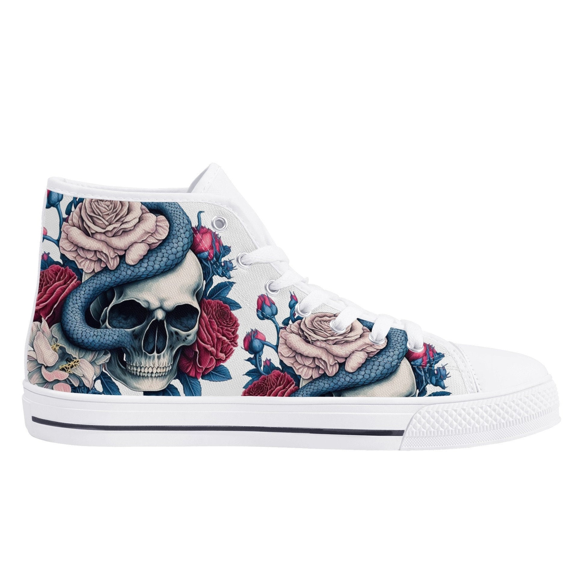 Biker skull shoes for her, evil face shoes gift, flower skull canvas sneakers, christmas skull shoes for her, devil ghost shoes for her, biker skull shoes, devil ghost high top shoes, punisher skull causual sneakers, skull with scythes shoes, skull in fire causual sneakers, gothic skull high top sho WOMEN SIZE Size______Foot Length (cm) US5_______23.3cm US5.5_____24cm US6_______24.6cm US7_______25.3cm US8_______26cm US9_______26.7cm US10______27.3cm US11______28cm US11.5____28.7cm US12______29.3cm MEN SIZE Size______Foot Length (cm) US5_______25.3cm US6_______26cm US7_______26.7cm US7.5_____27.3cm US8.5_____28cm US9.5_____28.7cm US10_______29.3cm US11______30cm US12_____30.7cm US13______31.3cm US14______32cm All of our High-Top Shoes are custom-made-to-order and handcrafted to the highest quality standards. Full canvas double sided print with rounded toe construction. Lace-up closure for a snug fit. Metal eyelets for a classic look Soft textile lining with lightweight construction for maximum comfort. High quality outsole for traction and exceptional durability. Highbury insole make the the shoes comfortable and soft ,and scaly sole increases slip resistance The upper is made of canvas and the sole is made of rubber Feature: Wear-resistant and breathable,Fashion Trend Season: Autumn, Spring, Summer, Winter Occasion: Outdoor, Daily Gender:Men, Womne Care Instruction: Spot clean only Custom area is the upper, for custom areas please refer to yoycol mockup generator for details This product is made on demand. No minimums Multiple shipping options available, and cost varies on time efficiency. ======== All products in our store are only manufactured upon receiving an order from the customer. Please carefully review the product description and dimensions in the illustrative images before placing an order. The following cases are not eligible for return/exchange: 1. The product you receive matches the description. 2. The product dimensions (with illustrative images describing the dimensions) you receive match the description. 3. The product has been customized as per your request (e.g., printed with your name/image).