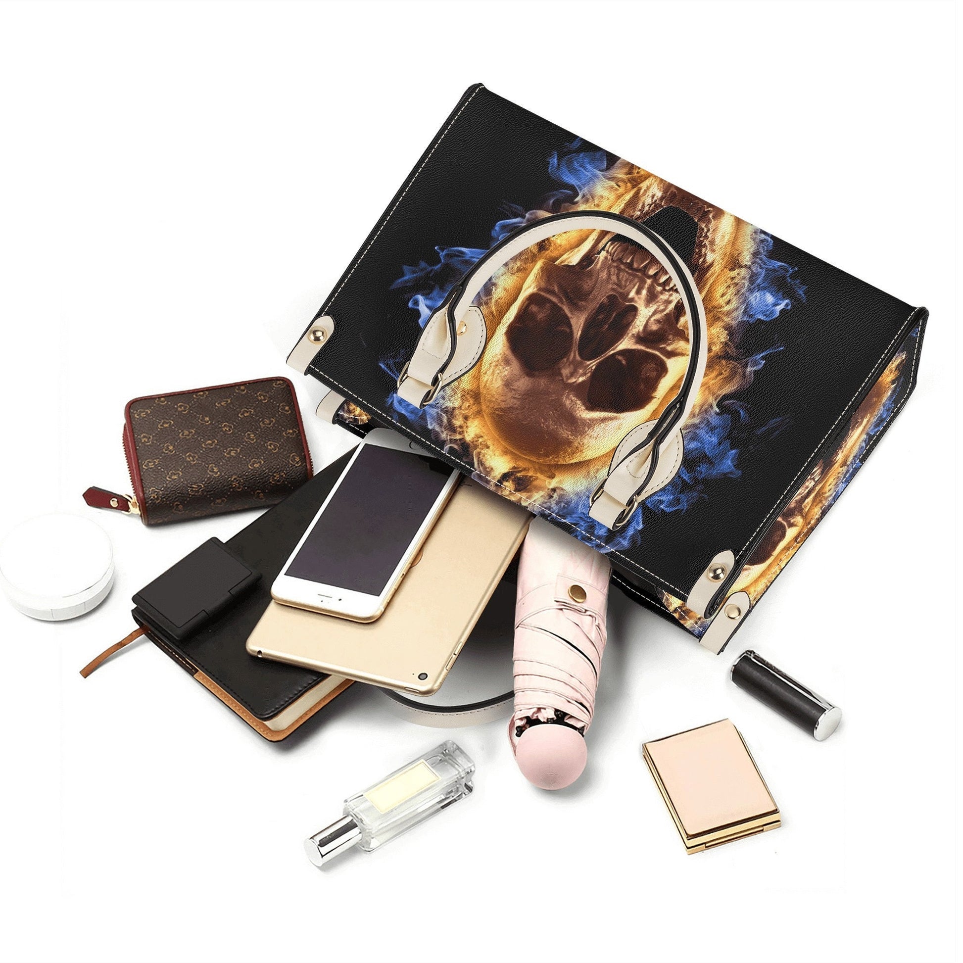 Goth travel bag, gothic skull tote bag, skeleton women's handbag, punisher skull handbag, flame skull handbag, spooky death travel bag skull