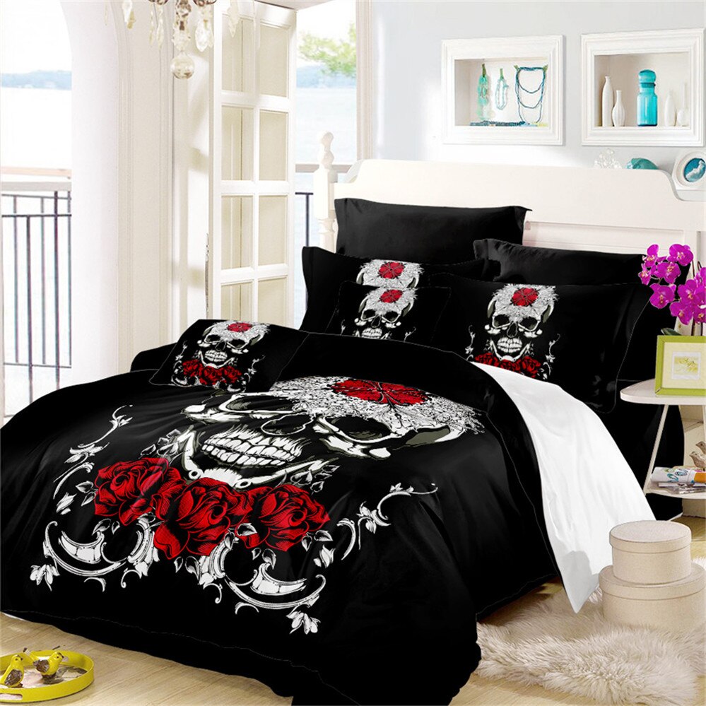 Ladies Sugar Skull Bedding Set Red Flowers Print Duvet Cover