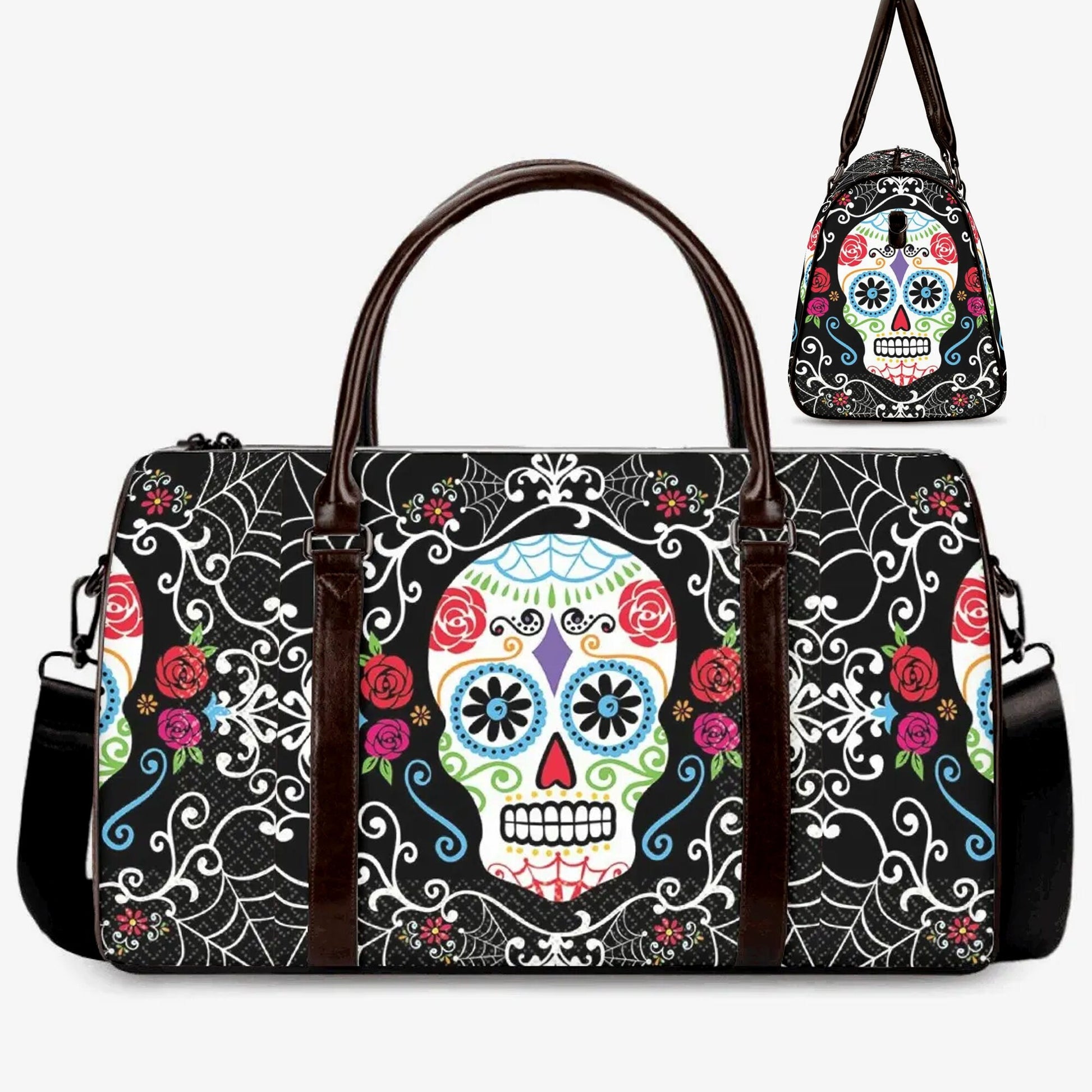 Dia de los muertos skull monogrammed bag, candy skull Canvas Weekend Travel Bag, floral skull Overnight Bag, mexican skull shoulder bag, floral skull Overnight Bag, candy skull large travel bag, candy skull Vacation Holidays Travel Bag, A classic luggage satchel with shoulder straps, which can be carried easily. A bag with large internal space that can hold many things. Made of canvas and PU Large capacity, portable The custom area is surface printing. This product is made on-demand. No minimums. There are multiple shipping methods available, and the fees may vary depending on the location and the shipping method. Add style to your luggage collection with a custom printed travel bag! Features a vibrant print on premium water-resistant and waterproof fabric. Finished with sturdy carrying straps and an optional adjustable shoulder strap. Inner compartments include a main partition perfect for all of your clothes and cosmetics; and a smaller zipper concealed compartment for your accessories. Size: S: 10 x 18 x 8.5in L: 11.5 x 21 x 9.5in ======== All products in our store are only manufactured upon receiving an order from the customer. Please carefully review the product description and dimensions in the illustrative images before placing an order. The following cases are not eligible for return/exchange: 1. The product you receive matches the description. 2. The product dimensions (with illustrative images describing the dimensions) you receive match the description. 3. The product has been customized as per your request (e.g., printed with your name/image).