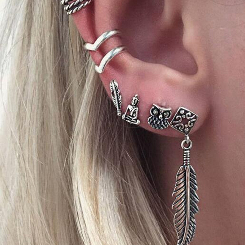 Punk Style Earring Sets For Women Ethnic Bohe Silver Color Ear Clip Tassel Earrings Feather Leaf Owl Earrings Wholesale