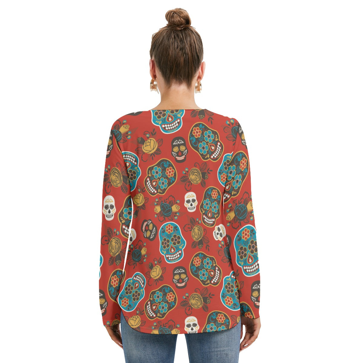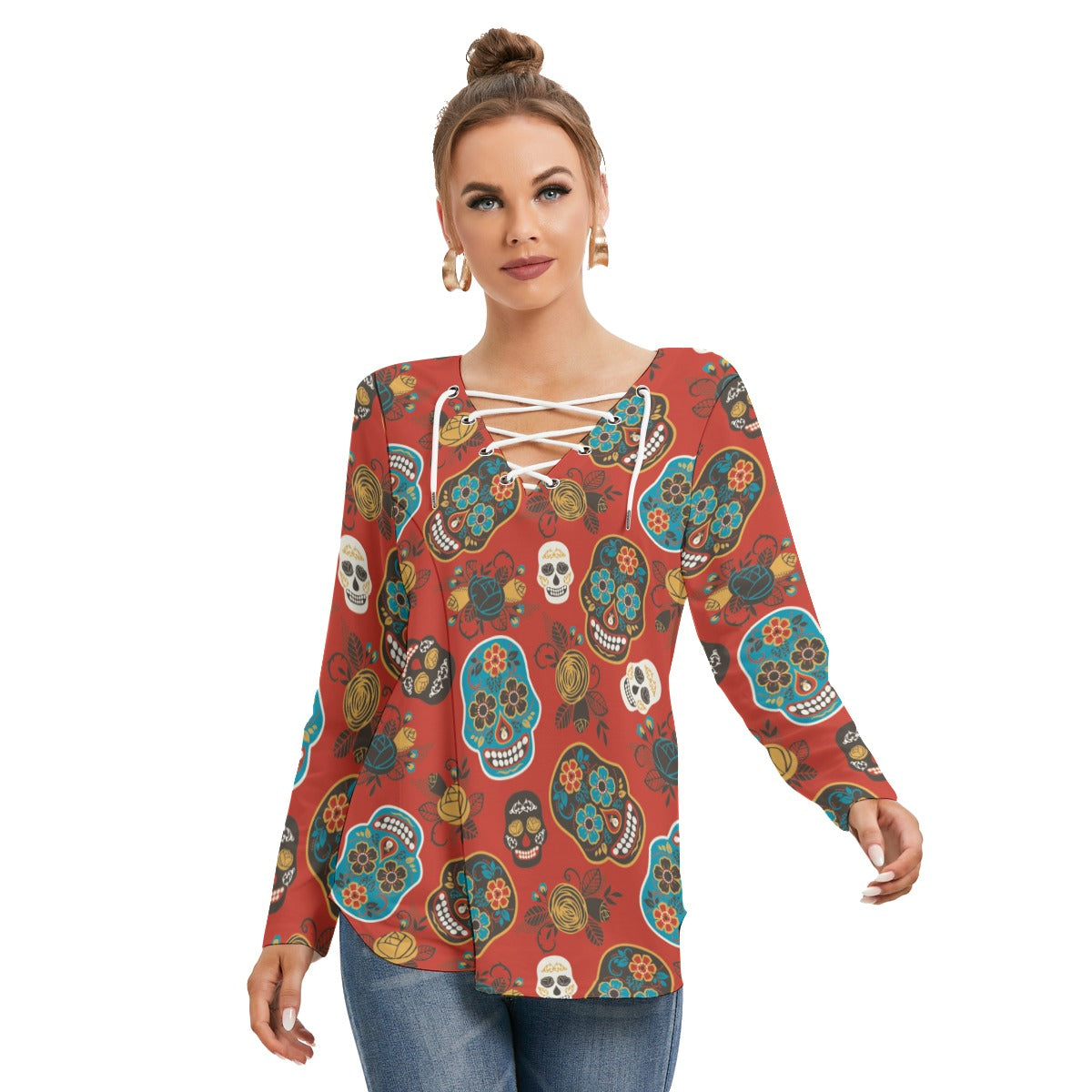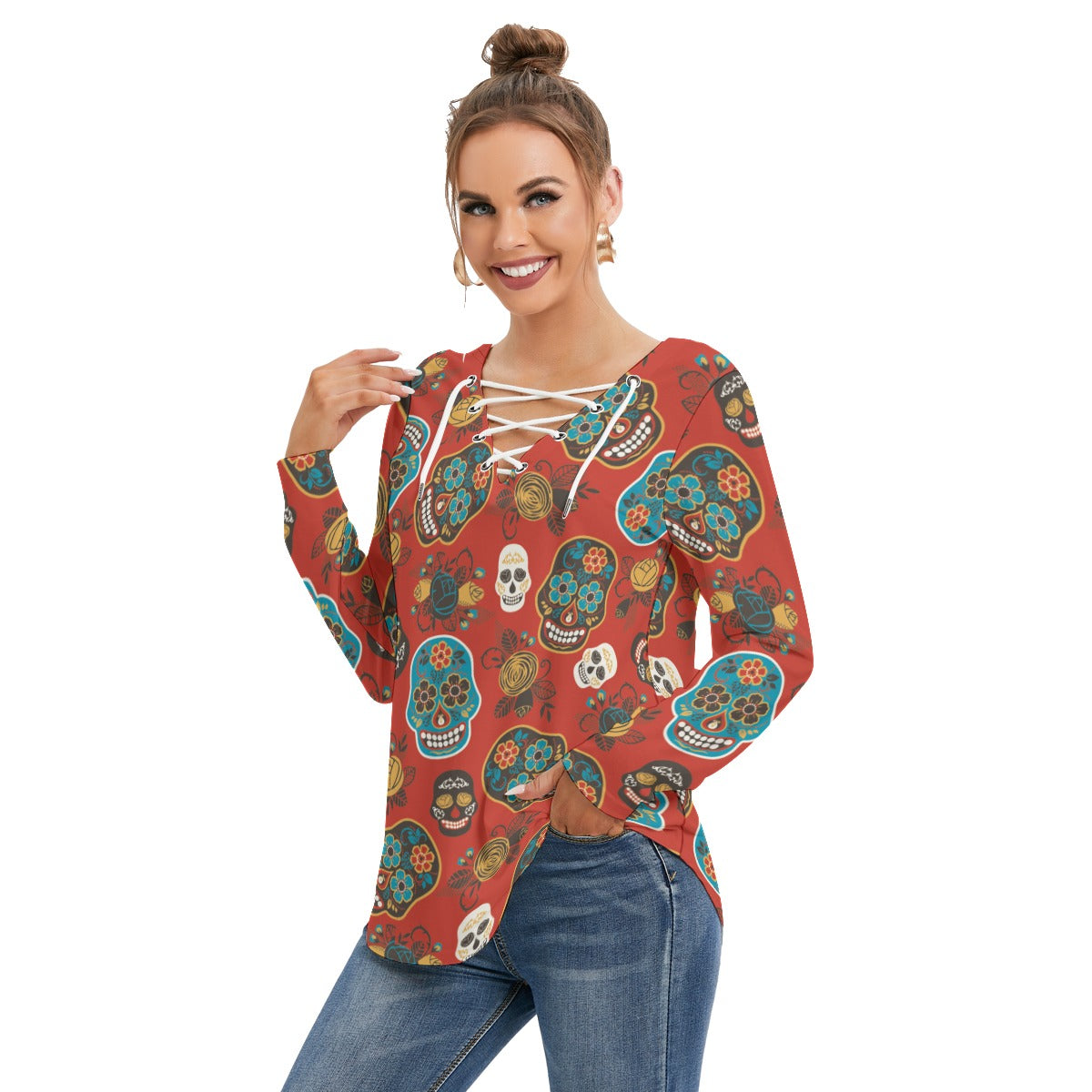 Sugar skull day of the dead Women's Long Sleeve Neckline Tie Sweatshirt