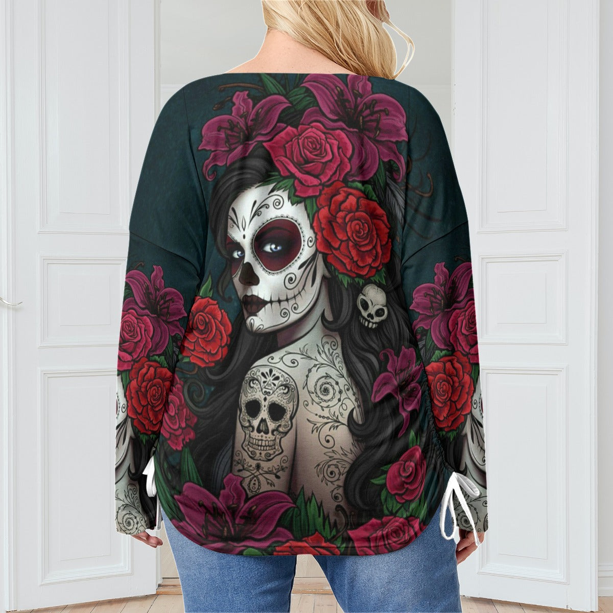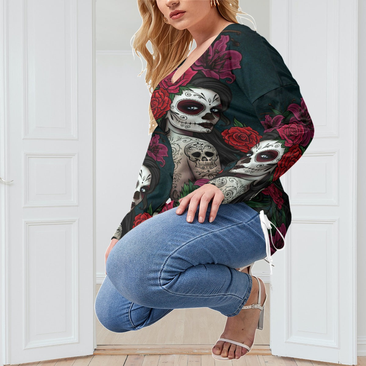 Sugar skull girl Women’s V-neck T-shirt With Side Drawstring(Plus Size), Sugar skull Women’s V-neck T-shirt With Side Drawstring(Plus Size)