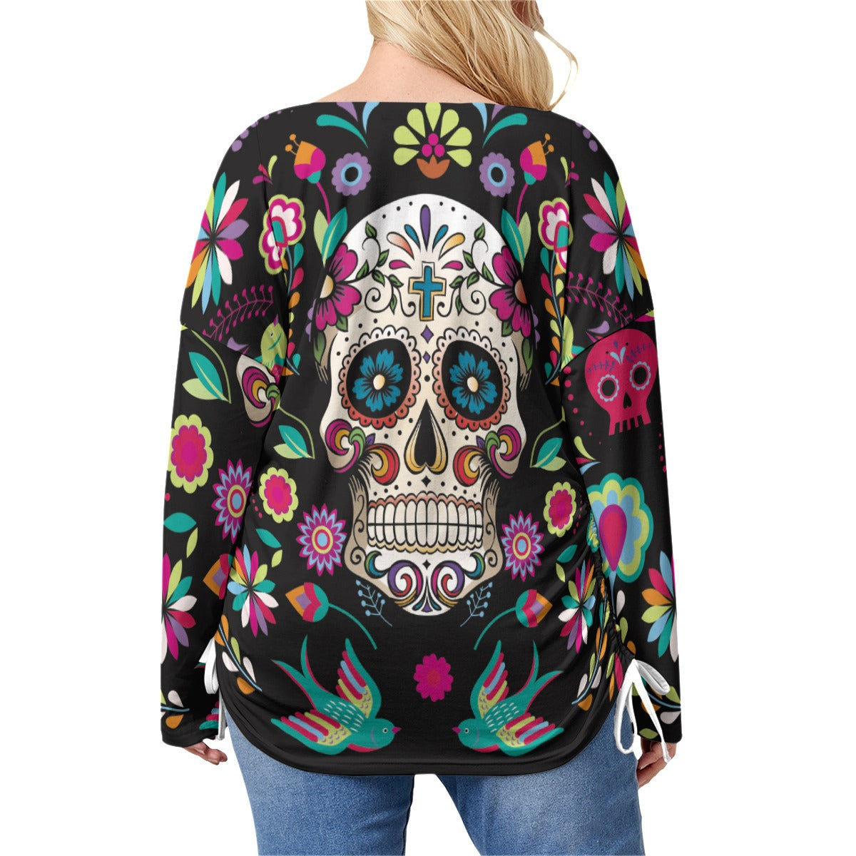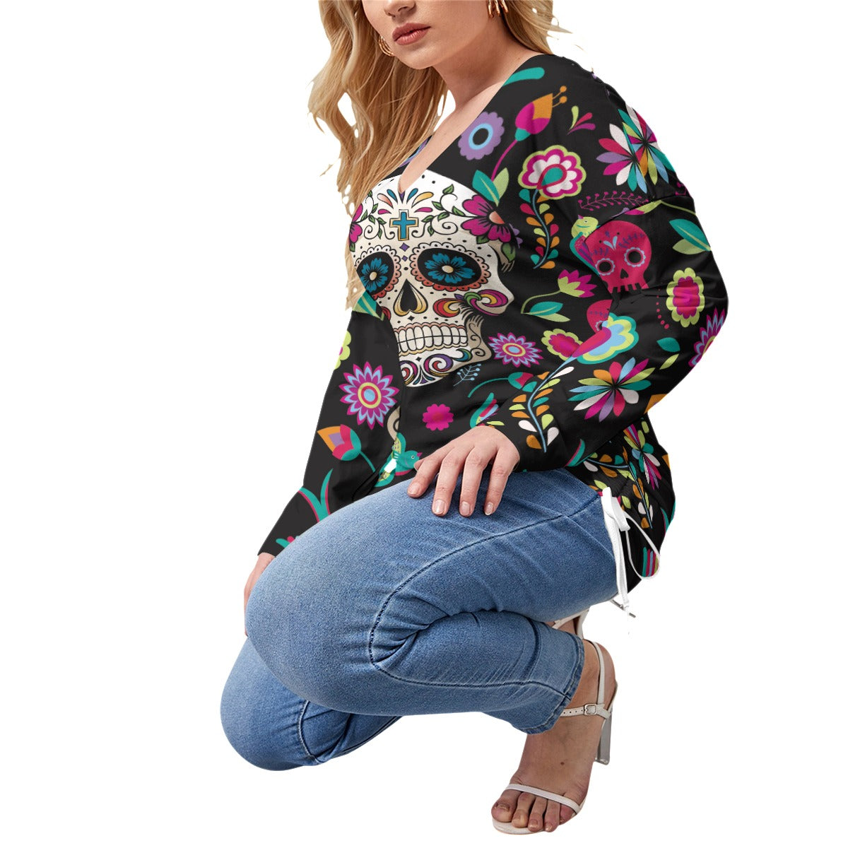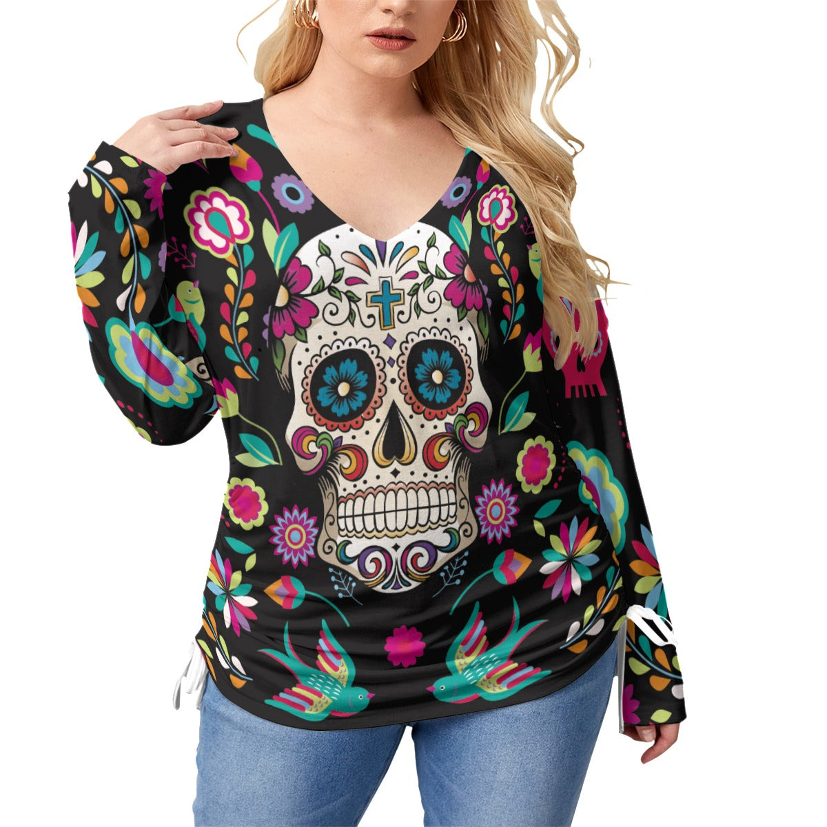 Sugar skull Mexican calaveras Women’s V-neck T-shirt With Side Drawstring(Plus Size)